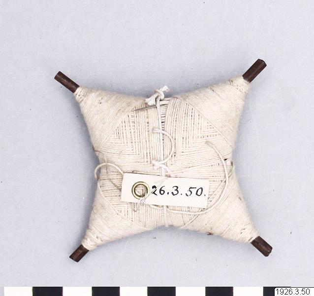 - Bomullstråd, lindad över ett träkors. (katalogkort/originalbeskrivning)