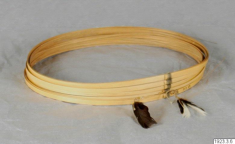 - Gördel för man av burityremsor med två små fjäderprydnader. För vardagsbruk. (katalogkort/originalbeskrivning)