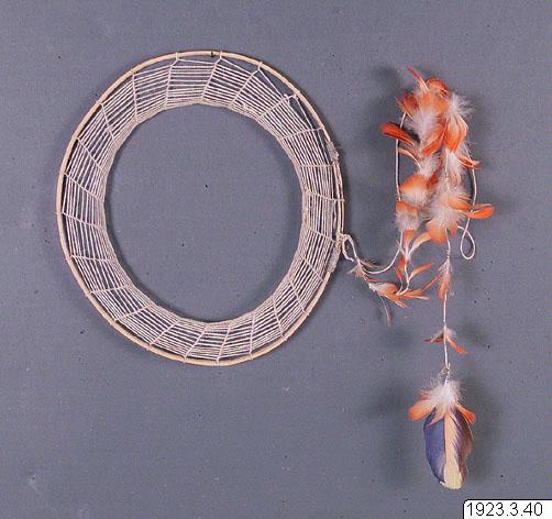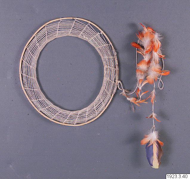 - Huvudring av burity med fjäderbesatt snöre i nacken. (katalogkort/originalbeskrivning)
