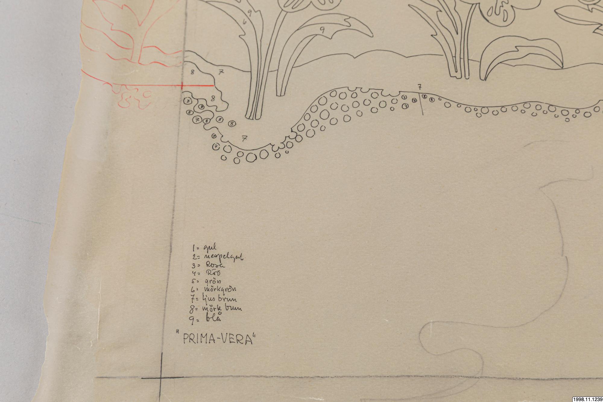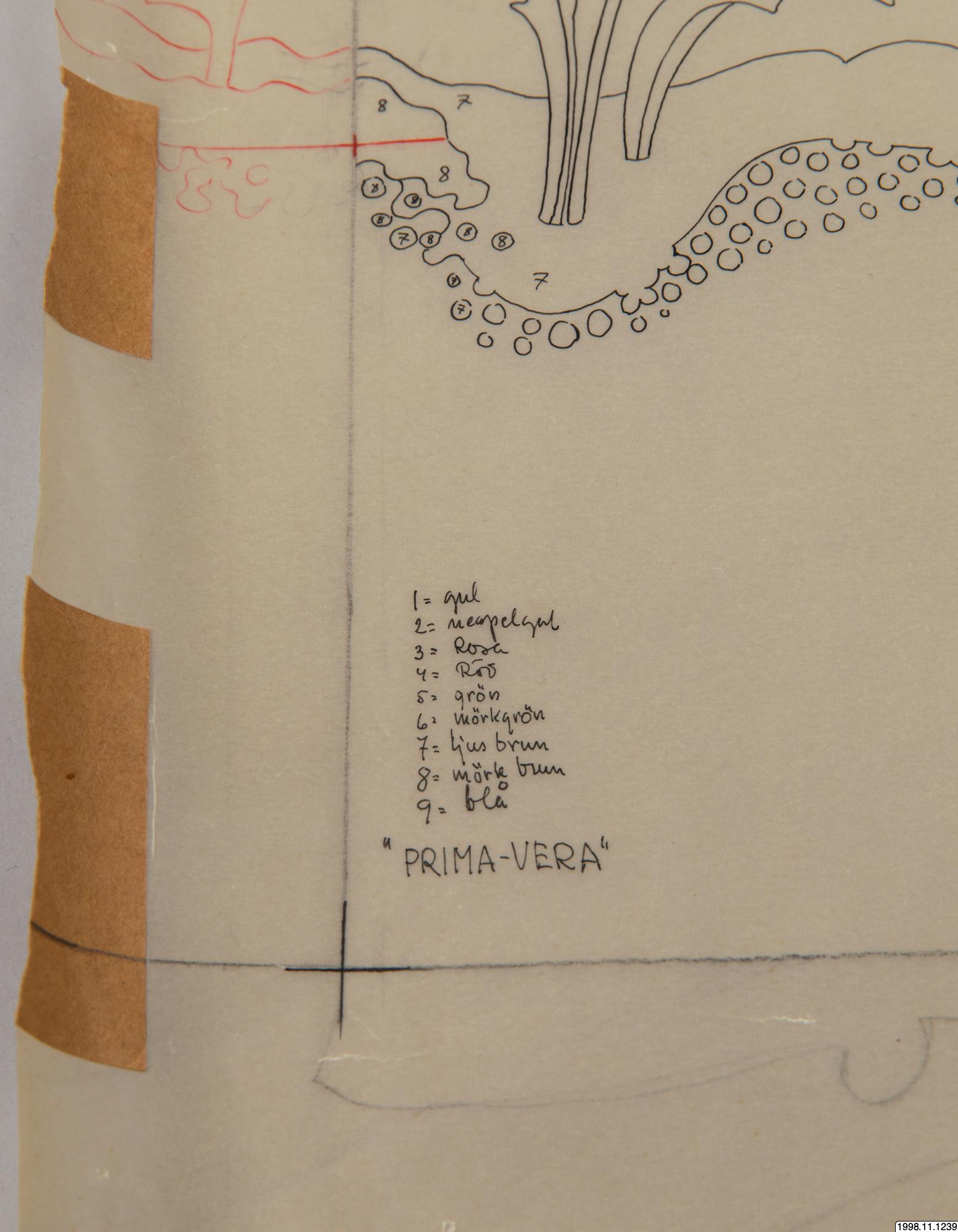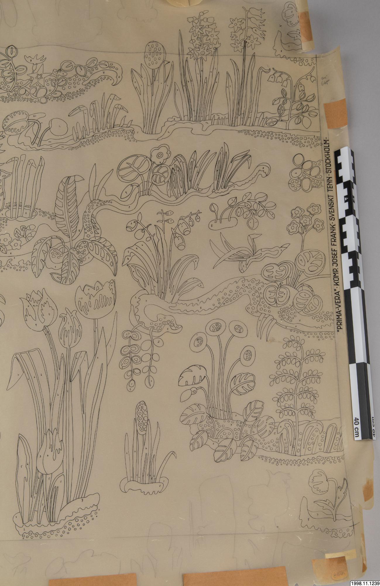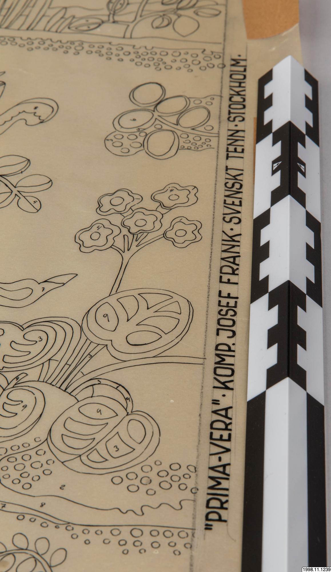 Mönster: arbetsritning, s.k. avdrag för filmtryck efter skiss till "Prima Vera" av professor Josef Frank. Utförd av Gösta Sandberg under hans anställning hos Erik Ljungberg (Mölndal och Floda). Finnes som tygtryck i