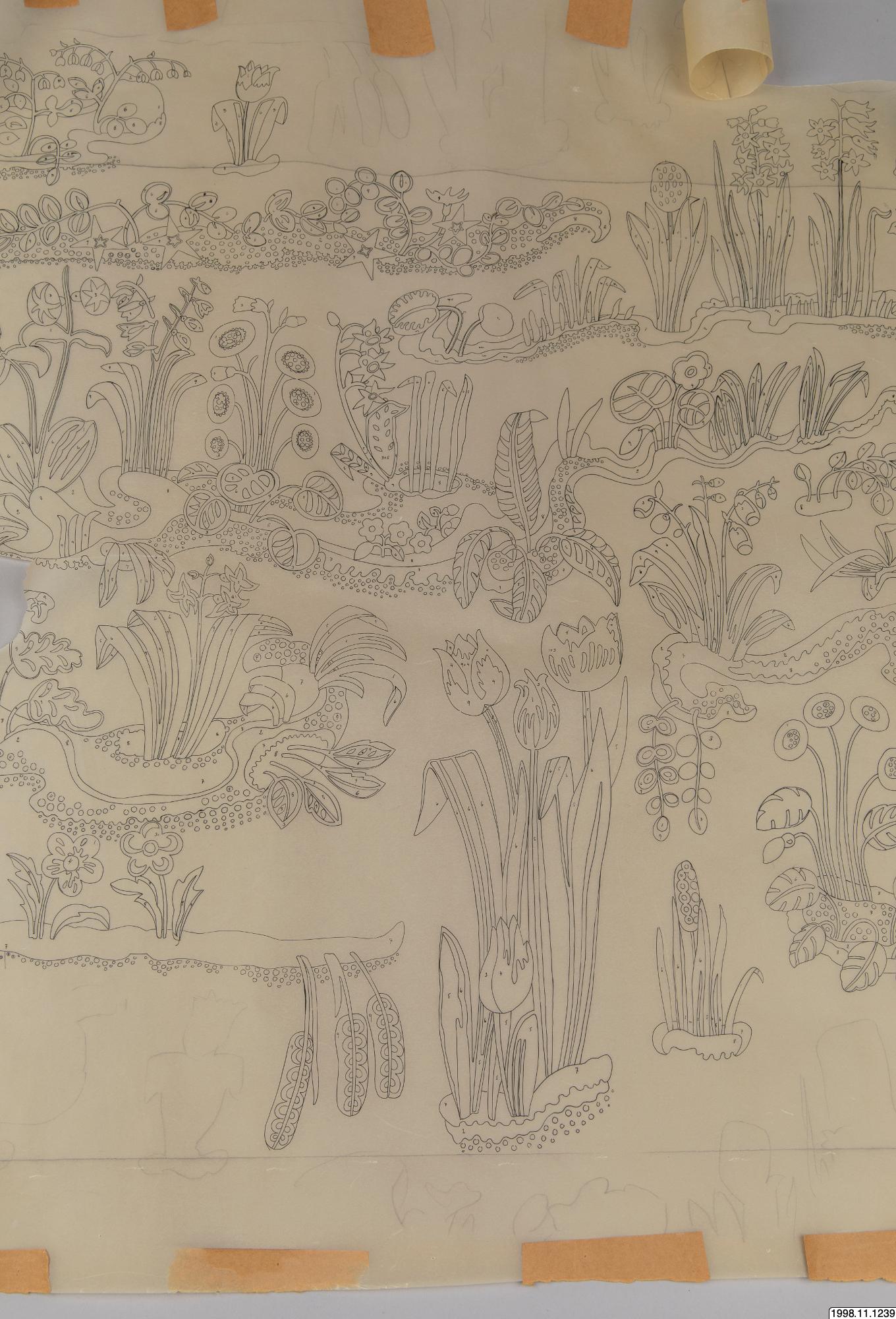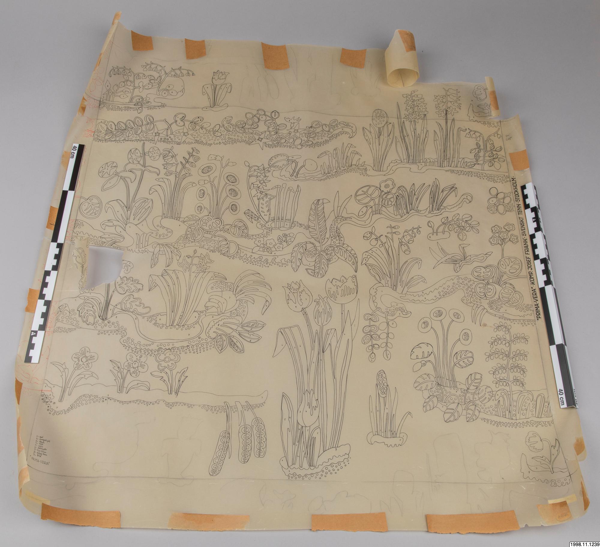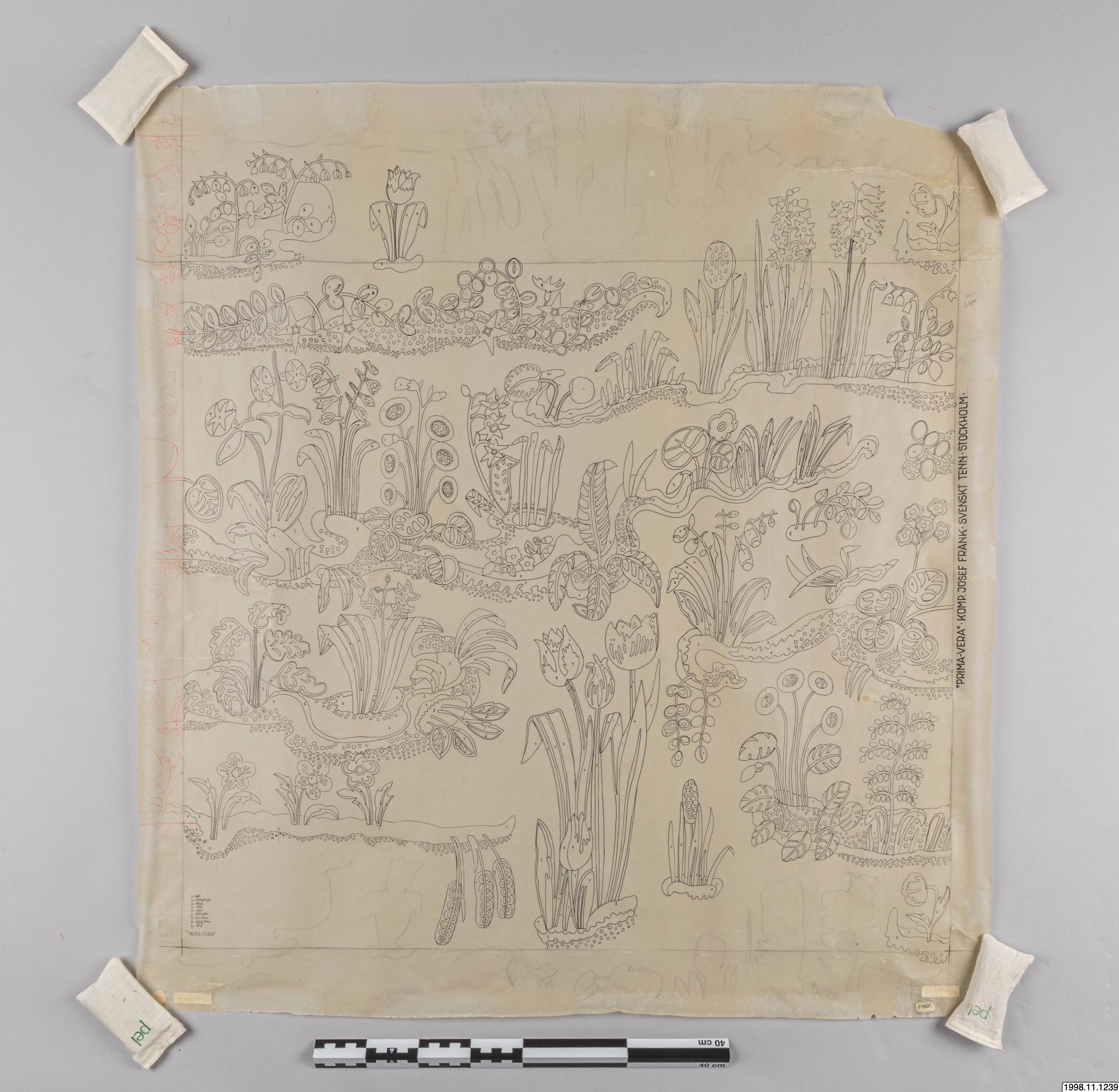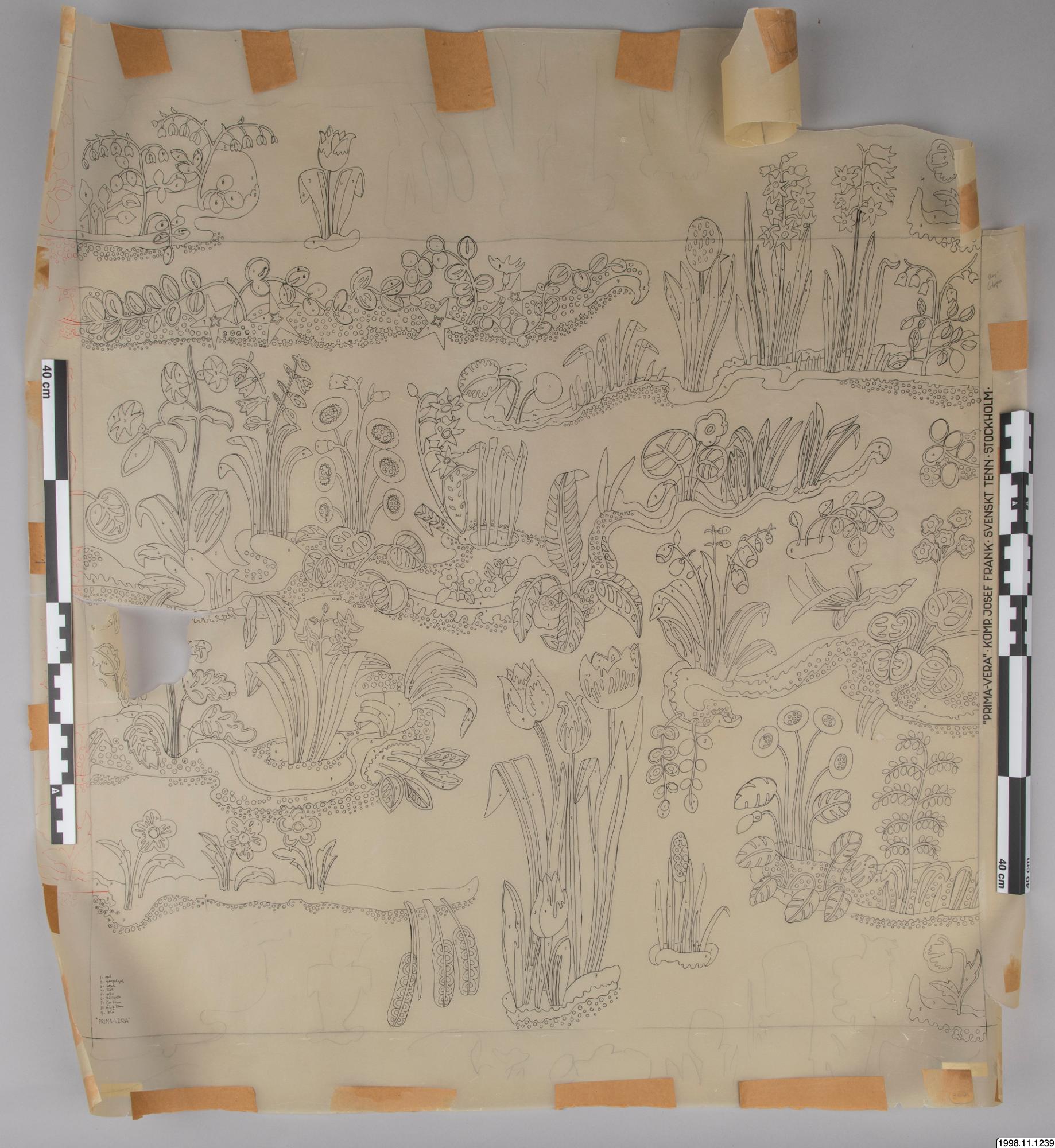 Mönster: arbetsritning, s.k. avdrag för filmtryck efter skiss till "Prima Vera" av professor Josef Frank. Utförd av Gösta Sandberg under hans anställning hos Erik Ljungberg (Mölndal och Floda). Finnes som tygtryck i