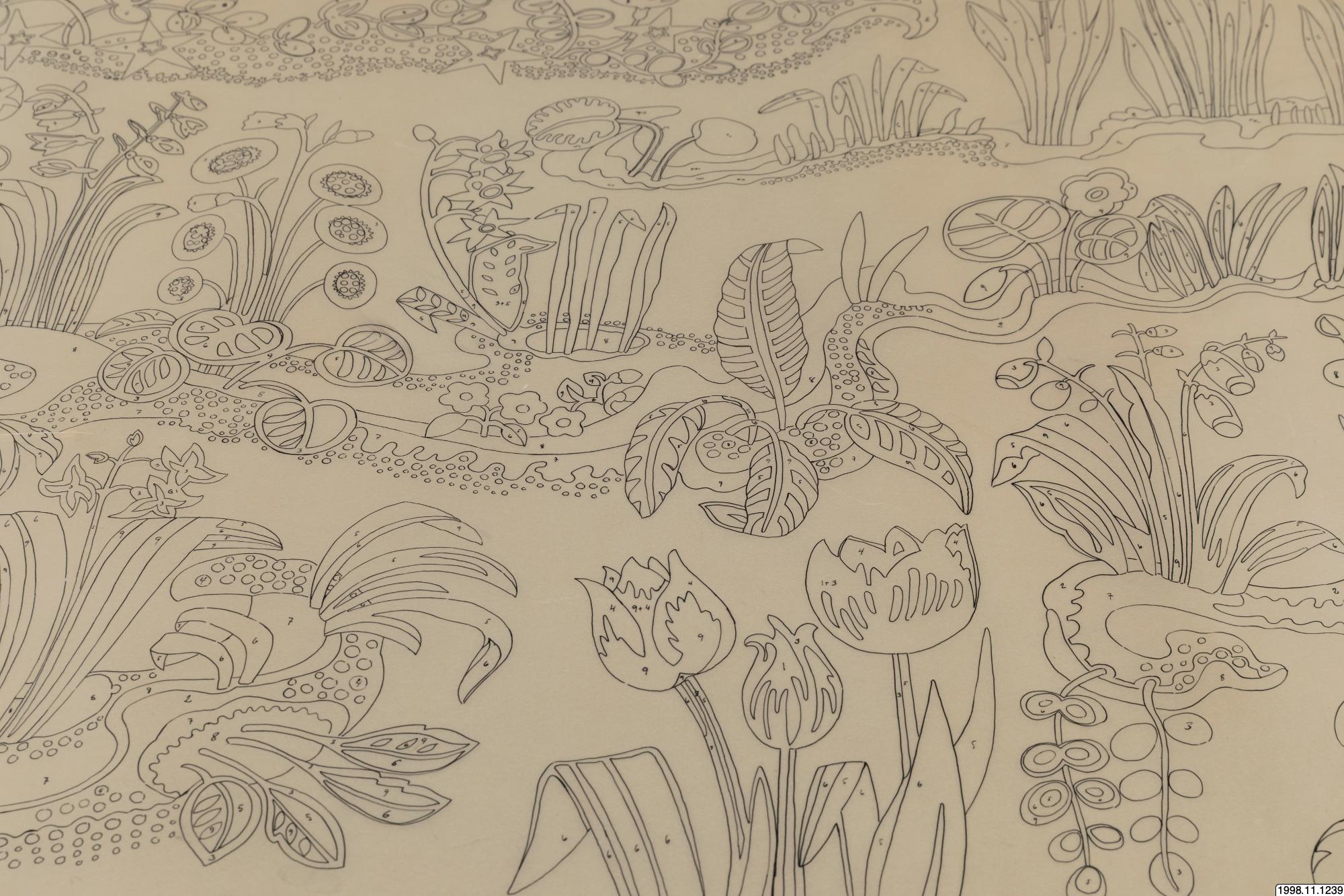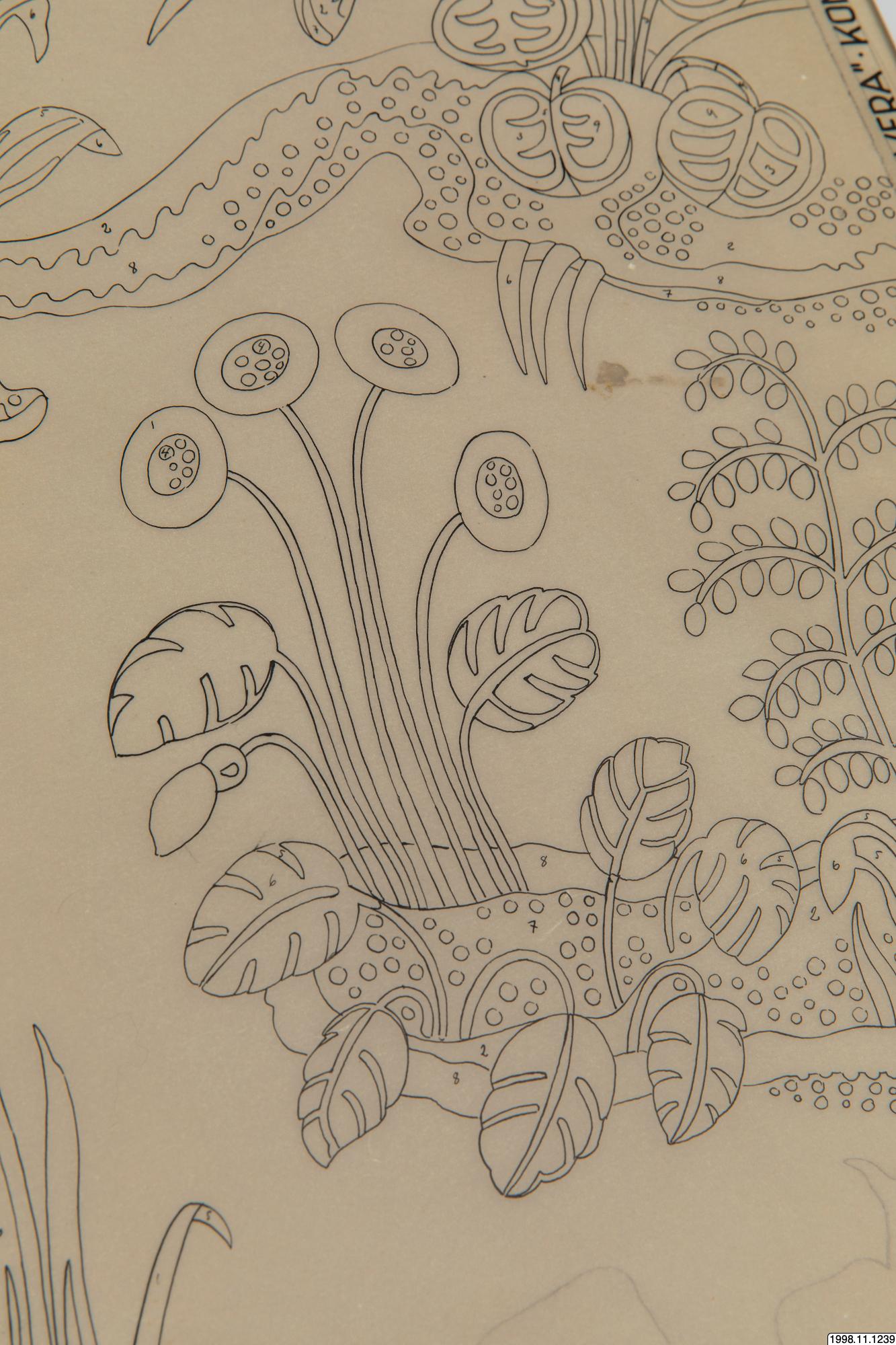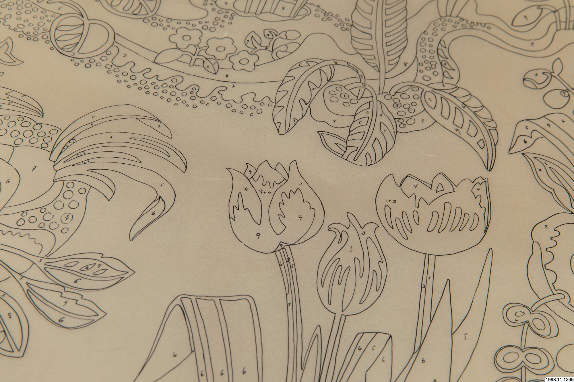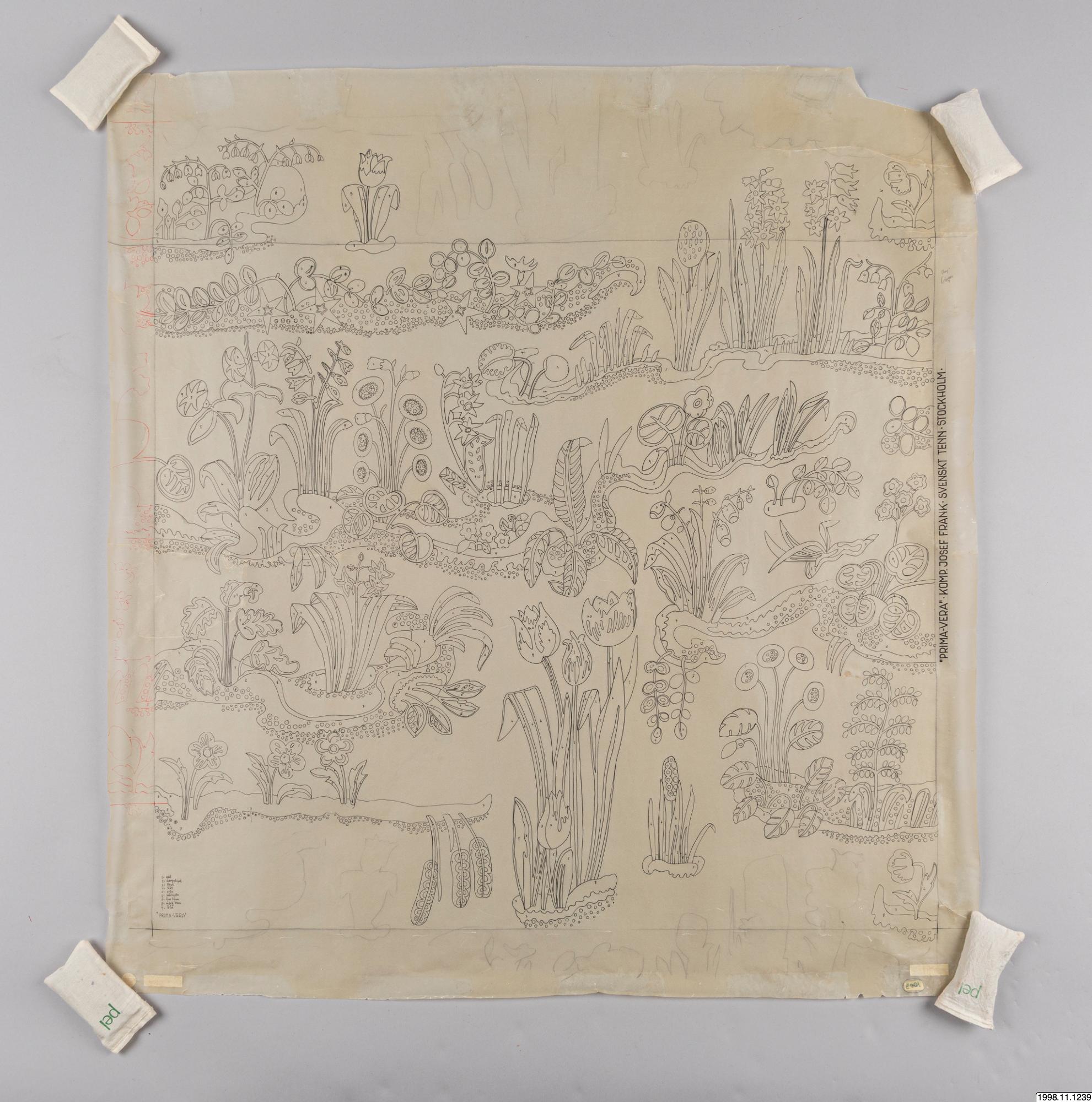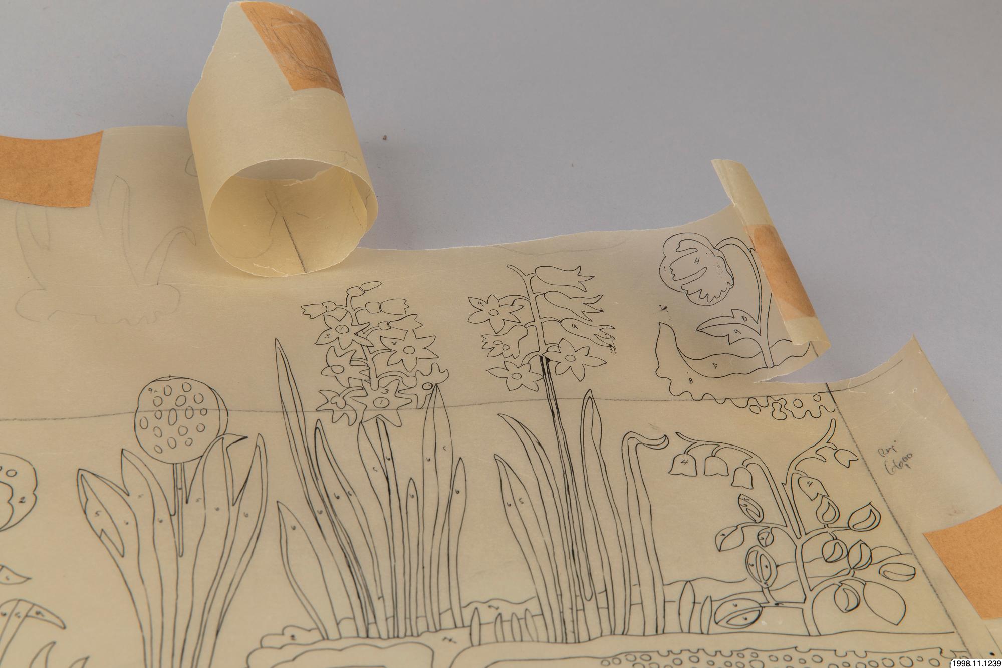 Mönster: arbetsritning, s.k. avdrag för filmtryck efter skiss till "Prima Vera" av professor Josef Frank. Utförd av Gösta Sandberg under hans anställning hos Erik Ljungberg (Mölndal och Floda). Finnes som tygtryck i