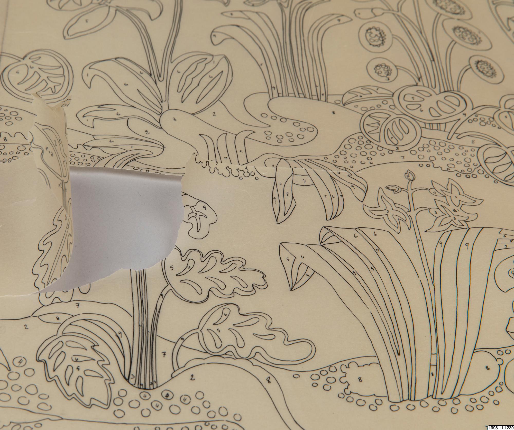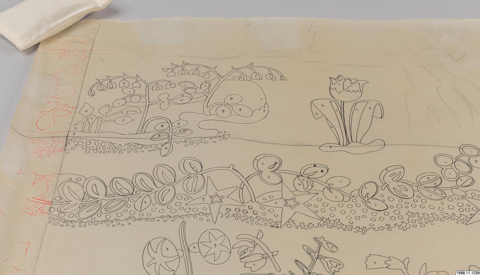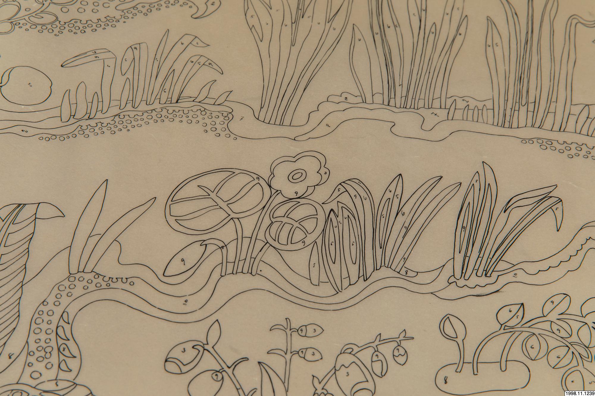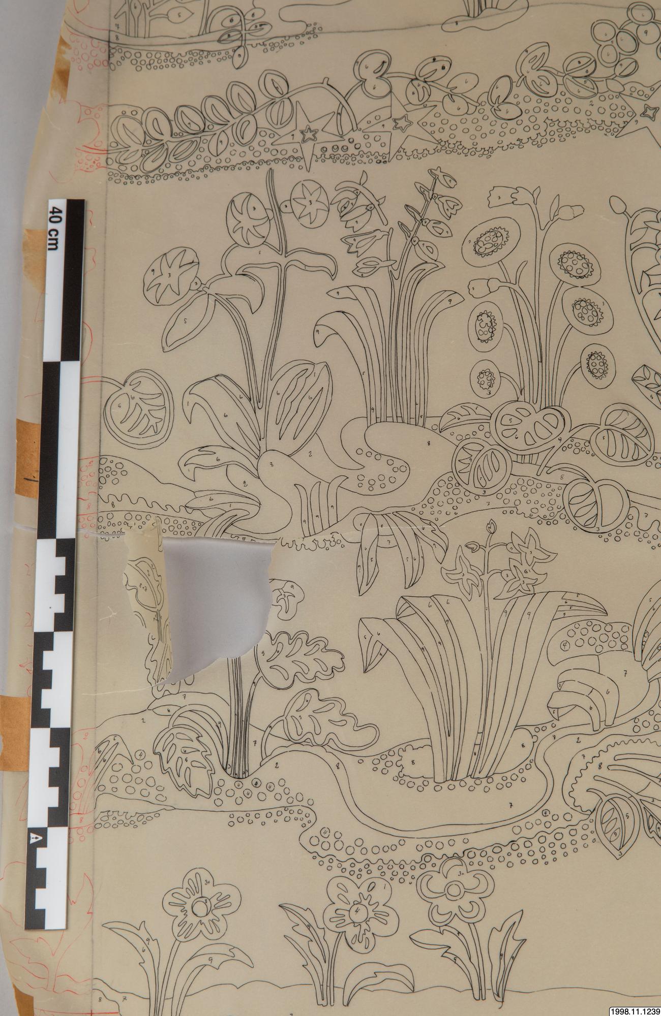 Mönster: arbetsritning, s.k. avdrag för filmtryck efter skiss till "Prima Vera" av professor Josef Frank. Utförd av Gösta Sandberg under hans anställning hos Erik Ljungberg (Mölndal och Floda). Finnes som tygtryck i
