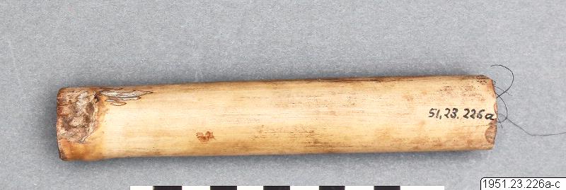 Elddon. Porslinsbiten och fnösket (av betelpalmen) slås mot bamburöret, så att man får gnista.
