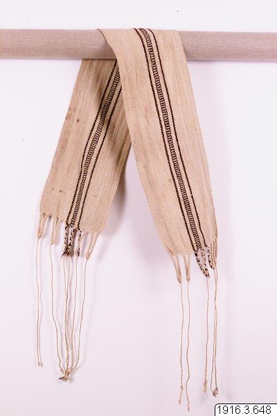 Bandet börjar och slutar med öglor och varpen är flätad till 10 st 4-kants flätor i båda sidor. Dessa flätor hålls samman 2 och 2 med en snodd av 12 st 2-tr vita trådar.