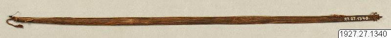 Anm. Ruben Pérez Kantule i Gbg.1931 till detta föremål: "Arco de flechas pequeñas "kinki" que los usan los indios blancos en tiempo de eclipse de la luna ó del sol: ségun los indios dicen para ahuyentar el dragón que está comiendo la luna ó el sol. Cuando la luna o´el sol están en eclipse los indios no salen más de la casa y solo hacen de salir a los blancos ó blancas para tirar sus flechitas contra el eclipse y dicen así el eclipse se desaparece. Y al mañana siguiente su dueño va a buscar sus flechas caidas de las casas vecinas.