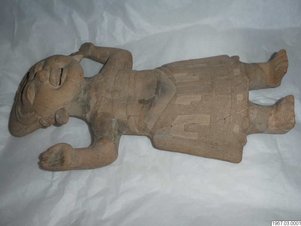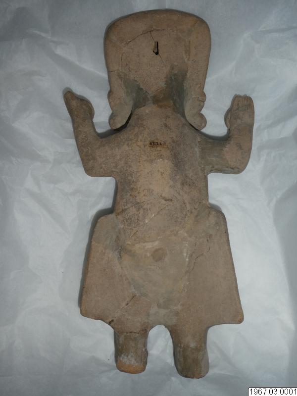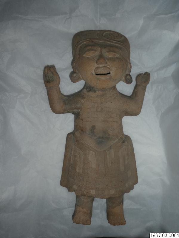 42 cm hög komplett människofigur (stående) i Remojadas-stil. Denna kultur, kallad Remojadas efter huvudorten för fynden, anses ha huvudproduktionen av sin figurkonst under sen klassisk tid i México, varför detta föremål vid förvärvet 1967 ansågs ha en ålder av ca.