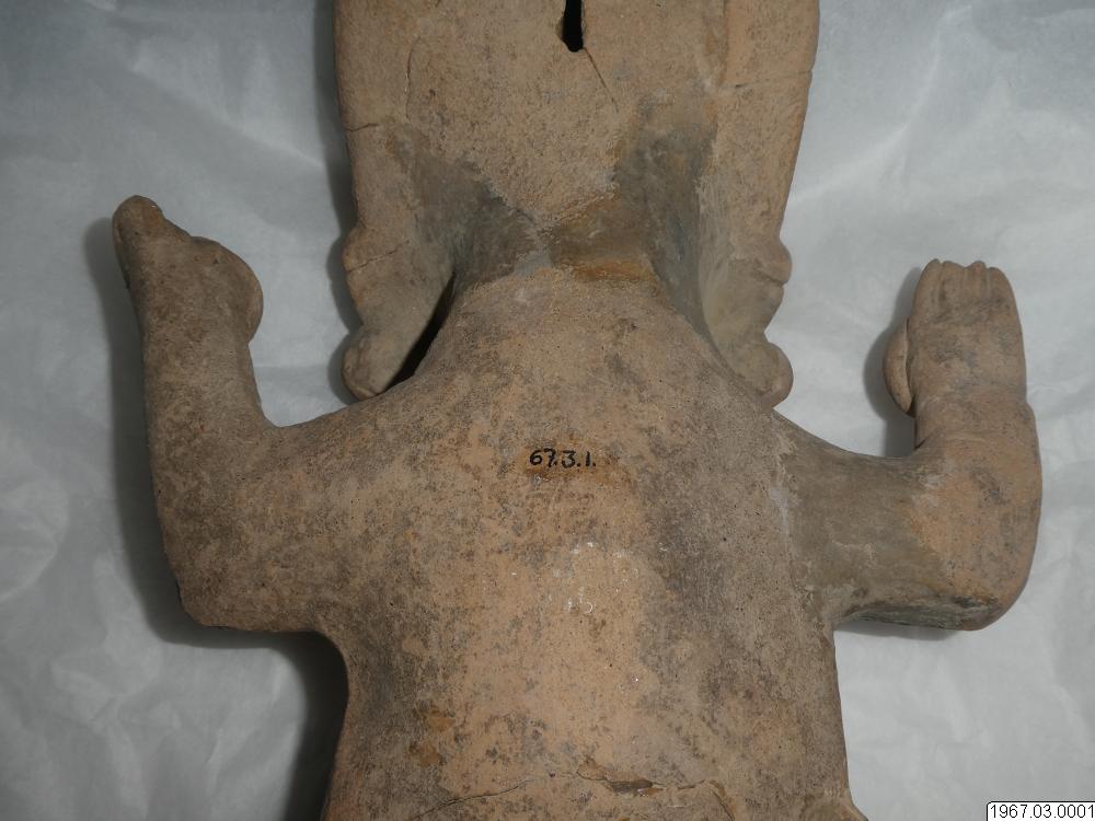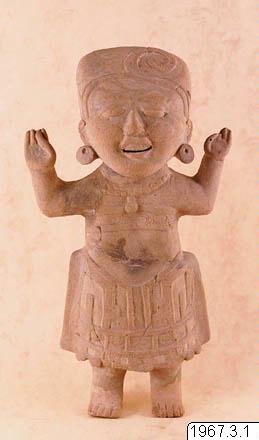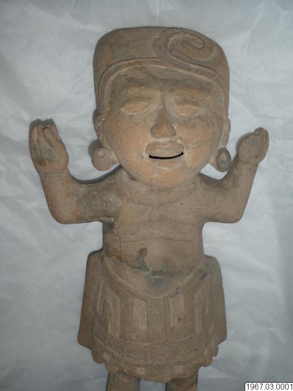1200 år. Figuren som varit söndrigt och restaurerats autentiskt visar en människa med upplyftande händer. Huvudet tillhör typen skrattande ansikten och har den karakteristiska hårslingan. Örontrissor har återgivits. Halsband och bröstornamentik. Nedtill en konstrik dräkt, men bara fötter. Figuren ihålig och har på baksidan av huvudet en springa för troligen rent tekniska skäl (utlopp för bränningsgaser). Öppningen vid vänster tinning trol. defekt från lagningen. Pris 120 dollars U.S.