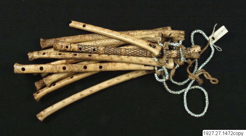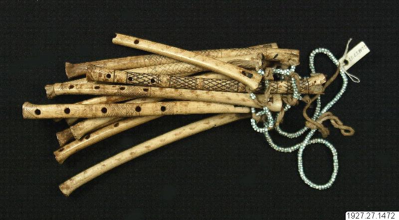 - Bröstprydnad med graverade benflöjter, användes av männen