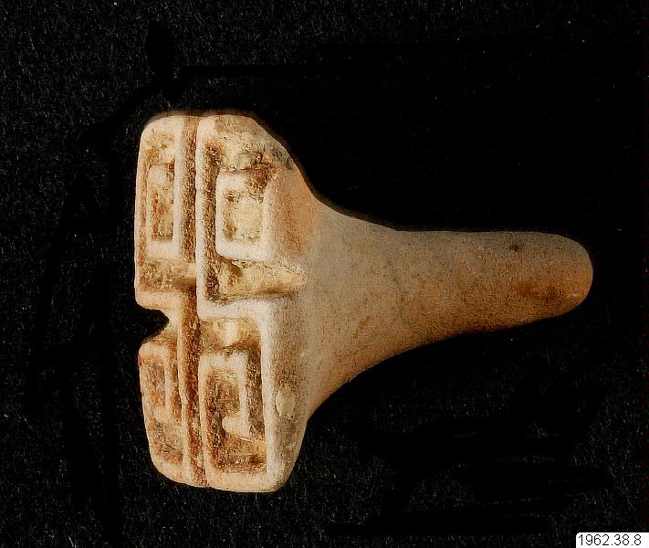 - Stämpel av lergods med kvadratisk stämpelyta och toppformat skaft. Något defekt. Stämpelmönstret ger alagreckmönster. Köp tillsammans med nris 6 och 7. Se nr 6