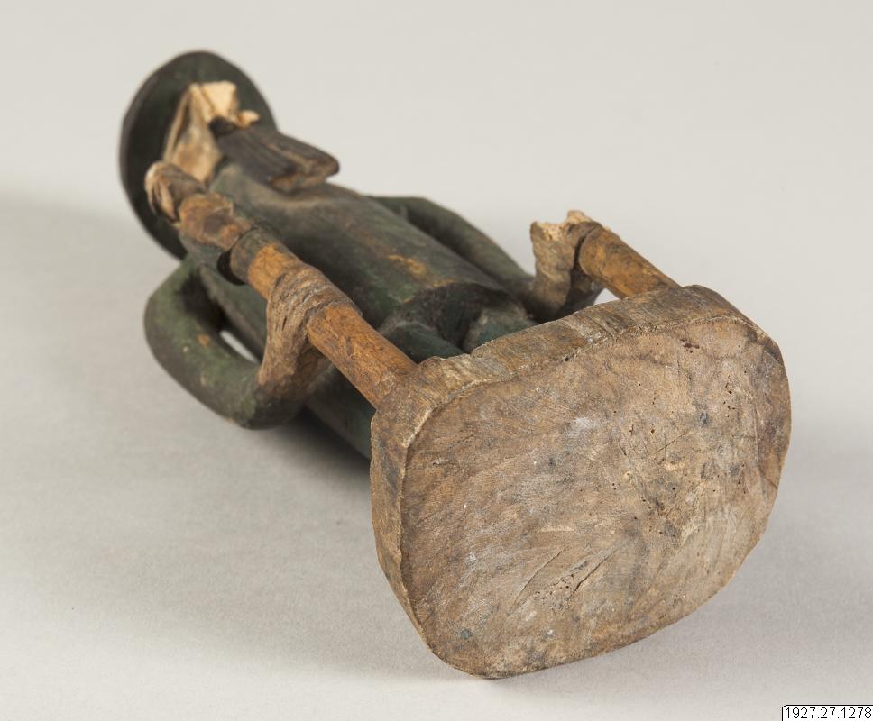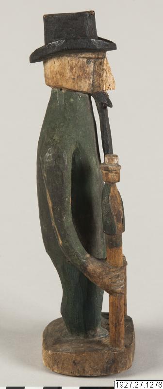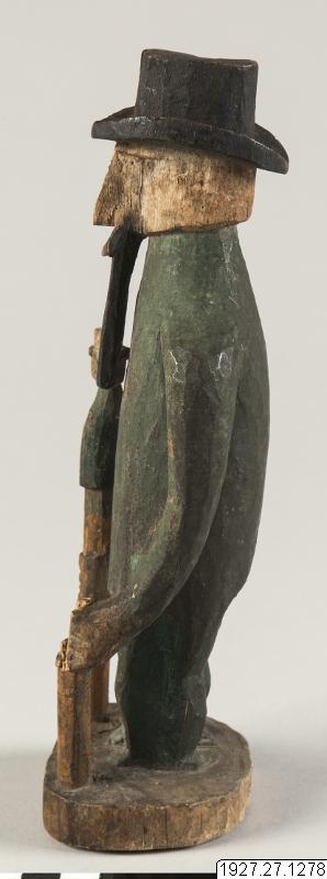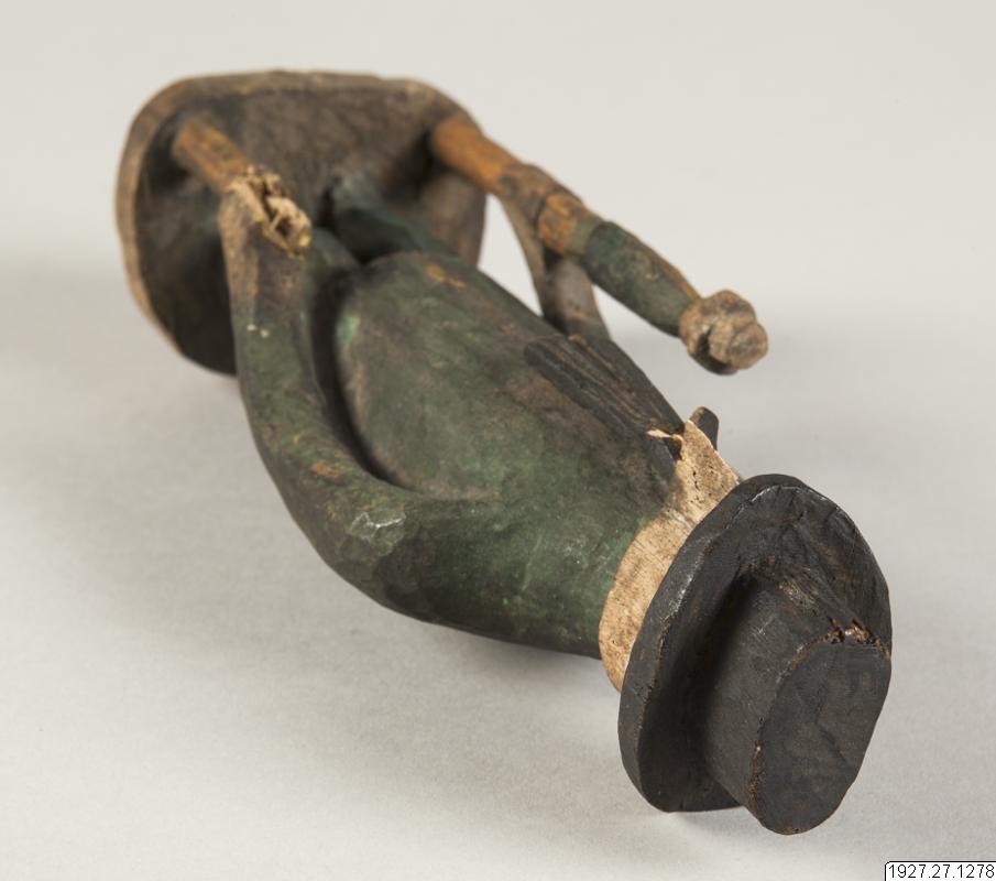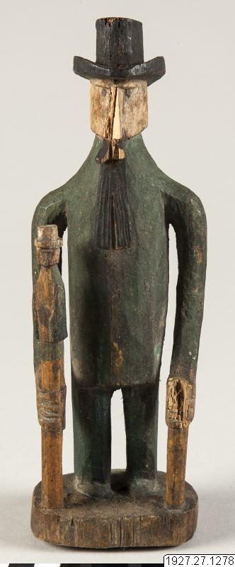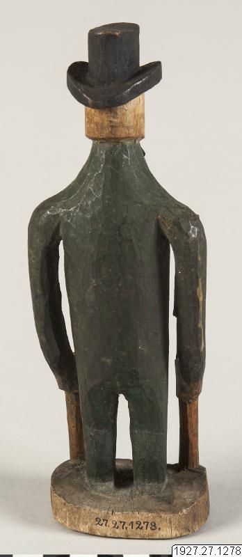 Träfigur iklädd 1700-talsdräkt. Anm. av Cunaindianen Ruben Pérez Kantule i Göteborg 1931: "Suarmimmi", fetiche con bastón en mano. Para buscar el alma perdida (veáse el no. 1288).