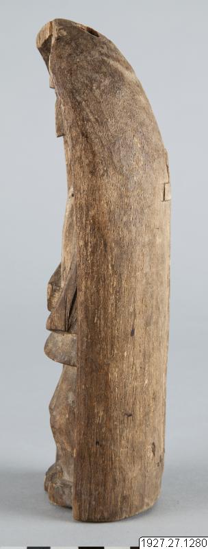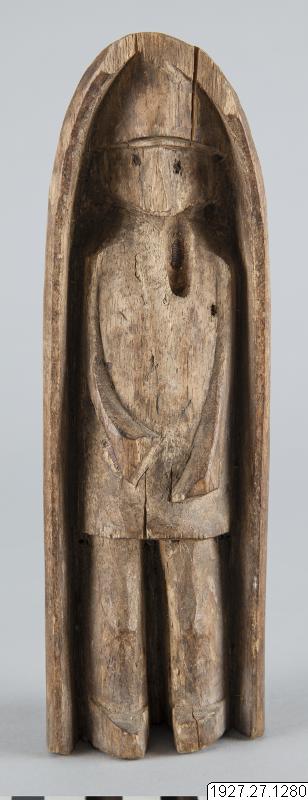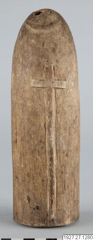 Träfigur som visar kristet inflytande. Vid upprepade tillfällen alltsedan 1500-talet har särskilt jesuiterna sökt att omvända cunas till kristendomen, men har aldrig haft bestående framgång. Anm. av R. Pérez Kantule: Suar mimmi", muneca, juguete de los chiquitines.