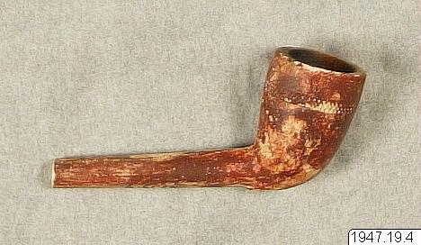 Tobakspipa av köptyp. Denna pipa använd av den döde Kantulpibi. I egenskap av kantule hade han fått den med på graven. Män i allmänhet får ej med sig sin pipa.