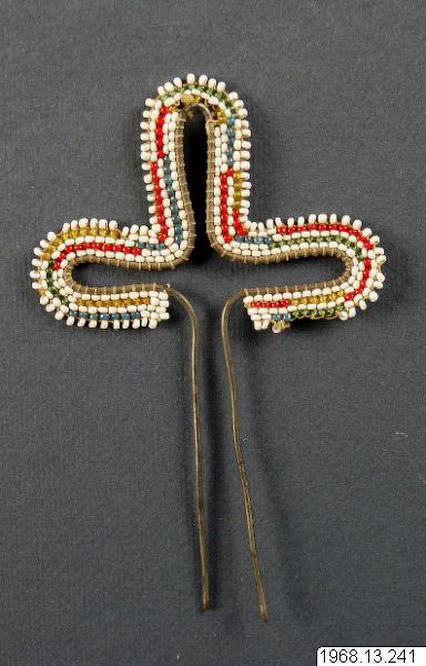 Hårprydnad. Kors av järntråd klädd med pärlor. Vita, röda, gula och gröna, något tillplattade glas- och porslinspärlor. Prydnaden fästs i håret. Storlek: 15,5 cm.