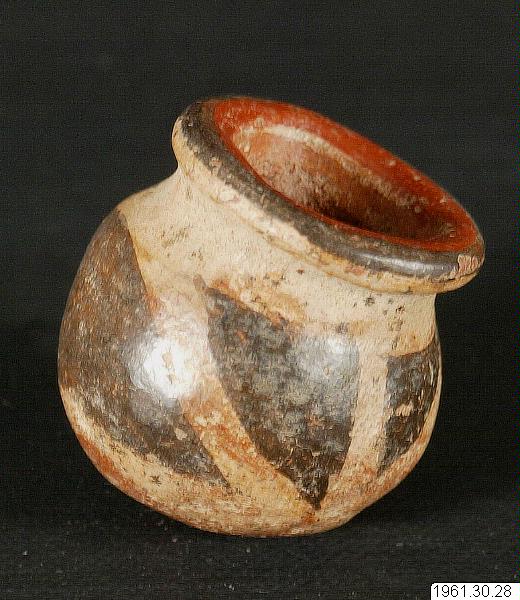 - Miniatyrkärl, endast 4,5 cm högt, rundbottnat, mynningen något osymetriskt. röd bottendekor, i övrigt fläckvis ordnad siddekor på den beige grundfärgen. (katalogkort/originalbeskrivning)