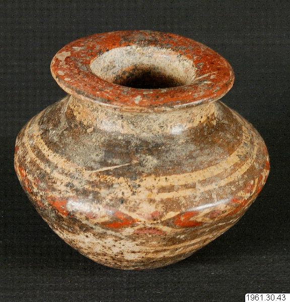 5,5 cm högt lerkärl med utsvängt mittparti och för storleken kraftig mynningskant, som på övre flata sidan är rödmålad. Även den rundade bottenytan röd, dekoren i övrigt i brunt och rött i cirkulära fält runt kärlet. Där över och underdel av kärlkroppens ytor möts en dekor i form
