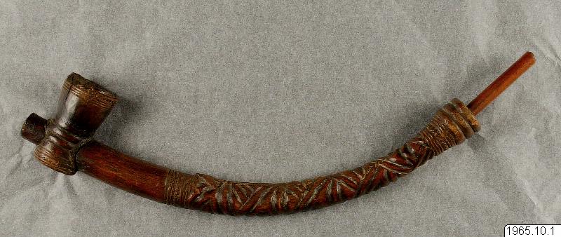 Rökpipa. Snidat svängt skaft. Pipskålen trädd upp på detta nertill. Munstycke av smalt växtrör. Pipans längd: 39 cm.