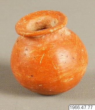 - 6 cm hög kruka av rödmålad lergods, diam. över mynningskanten 4,2 cm. Ur gruppen "Parita red ware miniatures."