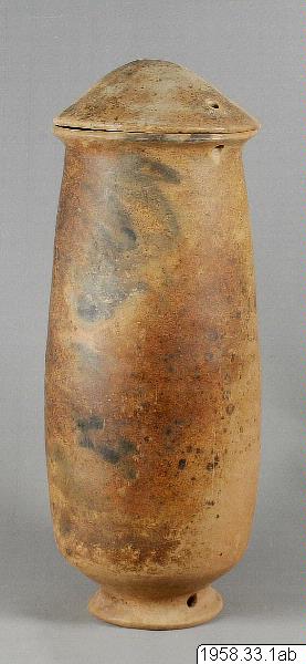 Cylinderformat gravkärl med lock. Denna keramikurna, som är 71 cm hög, har ett säskilt lock, som är kupigt, höjd 9,5 cm, varför vi får en totalhöjd om locket är påsatt av 80,5 cm. Kärlet som är av gulbrun färg karakteriseras beträffande färgen dessutom att ytan på både ut- och in-
