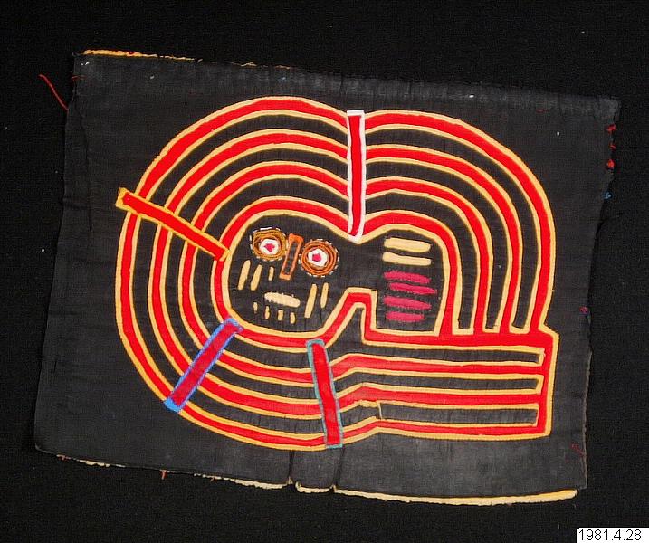 Mola- textil, del av kvinnoblus. Jämför 1981.04.0029 Motivet är "djävulens huvud": Nia nono mola "mola de la cabeza del diablo" (Chany Edman)