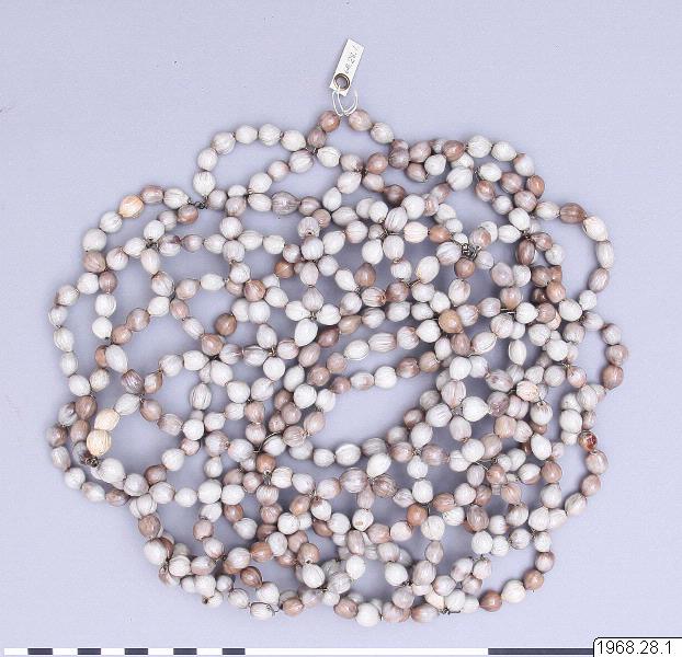 Föremål av med tunna metalltrådar sammanfogade frön av gräset Coix lachryma-jobi L. eller "Jobs" tårar" från ordningen Tripsaceae av familjen Poceae). Föremålet med en diam. av ca. 23 cm. har av givaren tolkats som en "liten korg", men ett ? för användningen. En form >