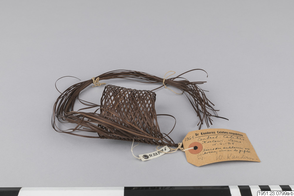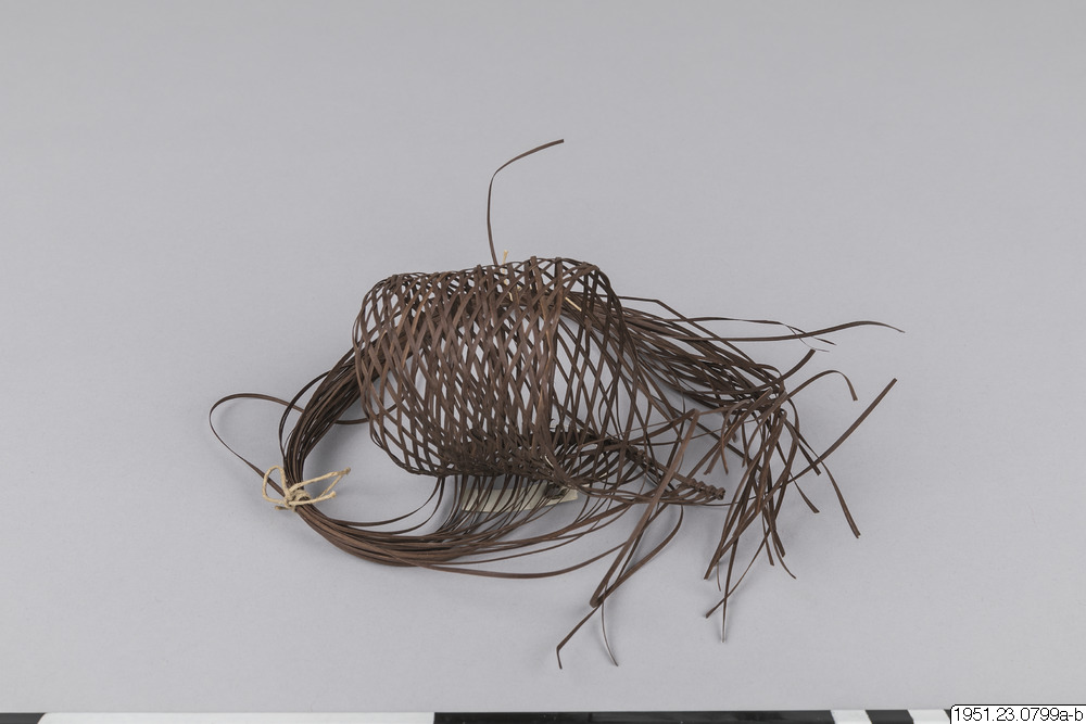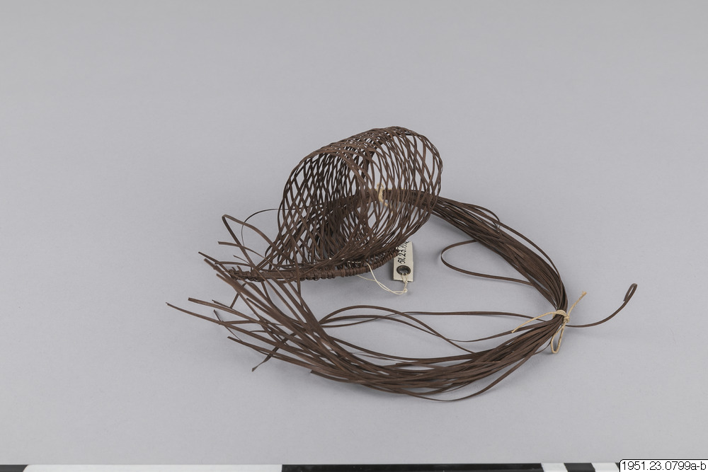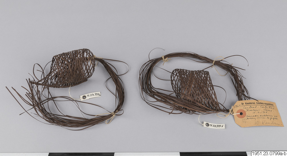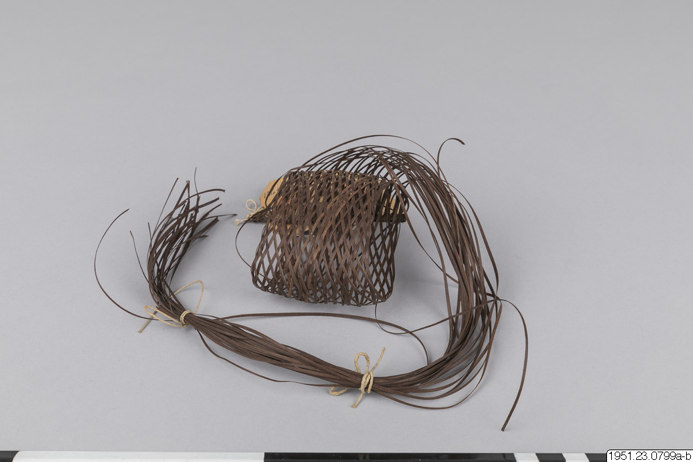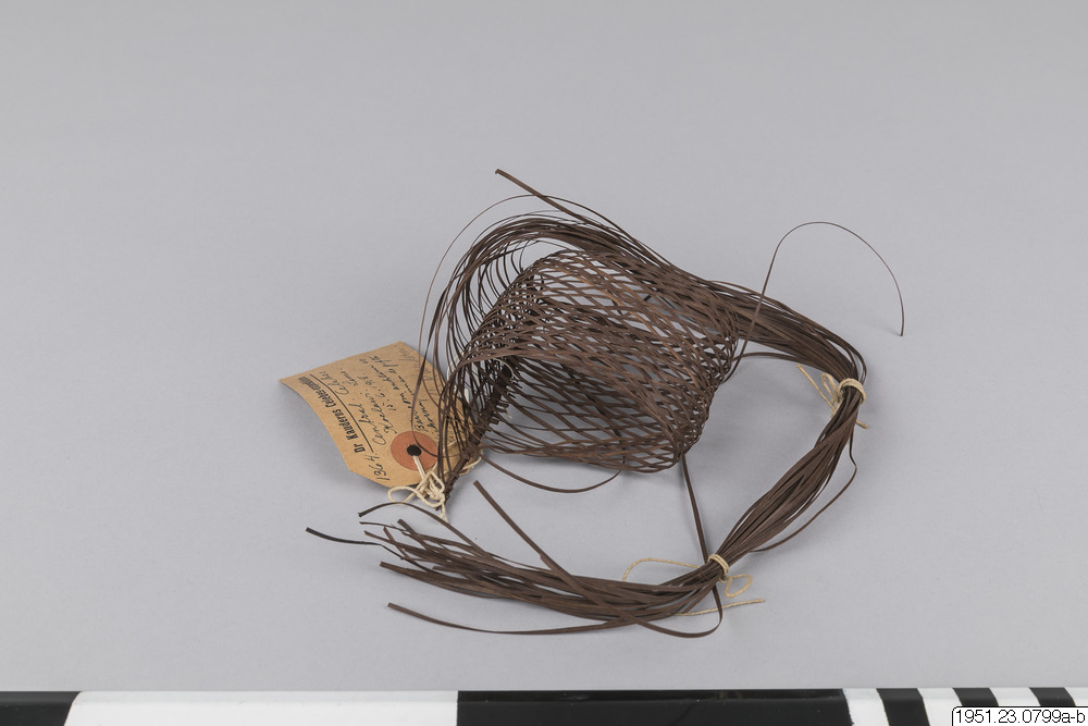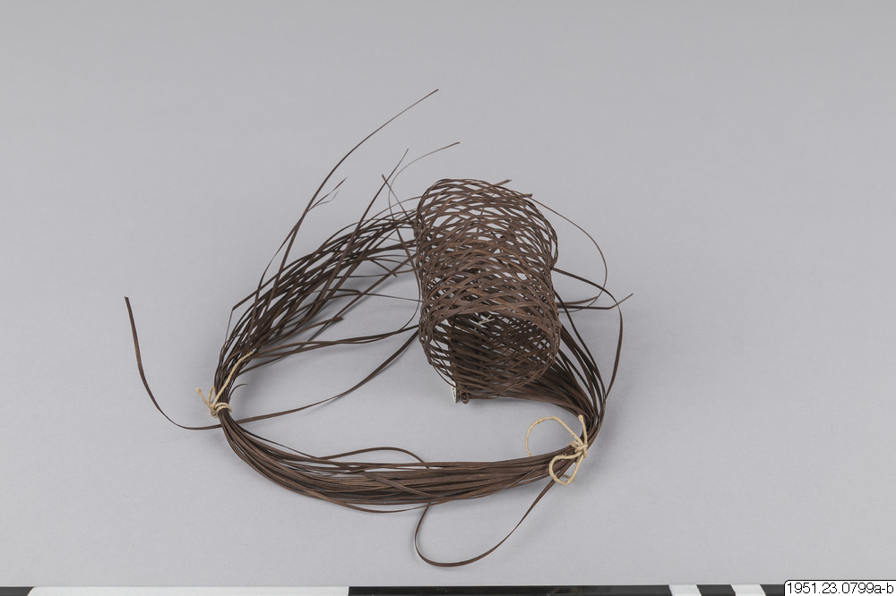 Ett par påbörjade ankelband för ogift kvinna. Flätad av äha, material som fås från en ormbunke, trol. Gleichenia dichtoma Willd. Orig. nr 1364
