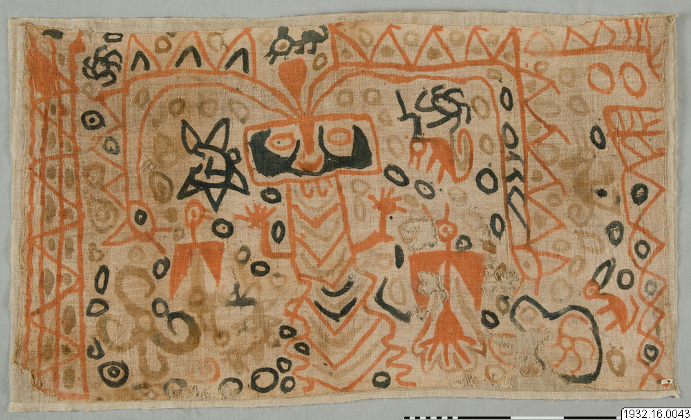 Antropomorf, zoomorf. Motivet består av en centralt plaserad mänsklig figur sedd framifrån. Figuren har huvudprydnad med två ormar som hänger ut på sidorna. Ormarna har sågtandad konturlinje längs ena sida. Figuren har armarna sträckta uppåt. Resten av tygets yta är fylld med fåglar och andra små djur.
