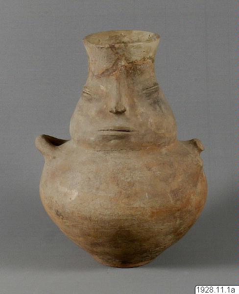 - Gravurna med människoansikte i relief. Innehåll: pärlor av snäckskal och bränd lera. 4 större prydnader av ben. Gåva.