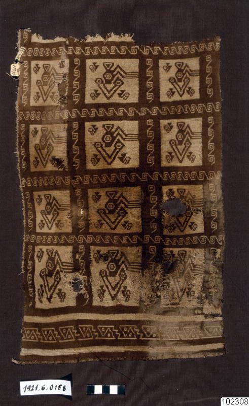 Teknik Dubbelväv ett brunt lager och ett vitt, 2 tr / stygn.Fragmentet har 3 grova uppläggningstrådar på en kortsida och stadkanter på långsidorna.