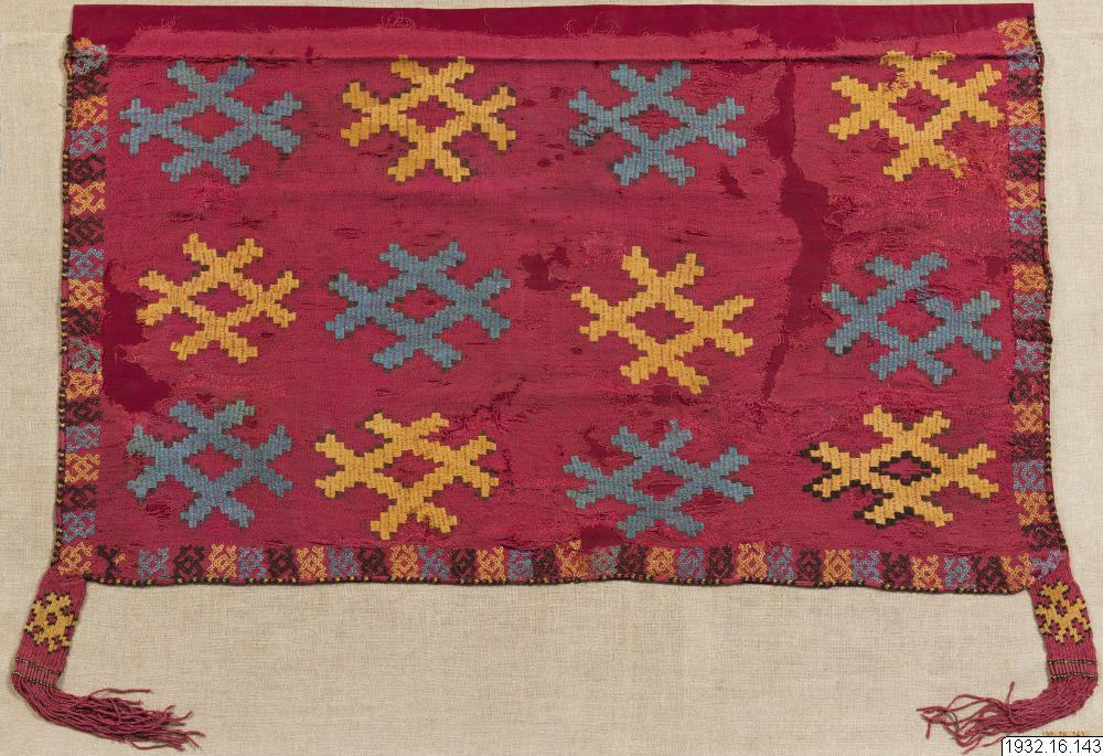 Teknik. Bottentyget är vävt i tuskaft, varpriktning är svår att säkert bestämma eftersom tygets kanter är översydda med en tät söm typ påtad snodd eller en variant av mask-stygn ( varpen brukar vara tätare än inslaget i denna typ av vävnad). Förävrigt är tyget broderat med en variant av stopp-söm och med bårder sydda i rut-söm. Stopp sömmen är troligen sydd i varpriktningen, därmed blir sömmen tät och täckande eftersom varptrådarna ligger tätt, tofsarna är gjorda av samma sorts stygn. Det är 12 "snodder" som är sydda i olika färger, samma som i broderierna, de är sammanhållna av ett "inslag". Tofsaran avslutas med en frans av den hårt tvinnade garnet i öglor. Jämför med 1932.16.0107, 1932.16.0118 och 1932.16.0073