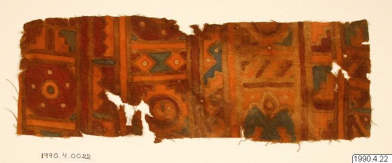 Teknik Tuskaft. Väven är målad med brunt, rödaktigt, blå, orange och gulaktigt grunt pigment. Mönsterformerna har tunna konturlinjer vilket gör att mönstret framträder klart och tydligt. Ev. har någon reservage teknik använts på några tunna nästan vita linjer.