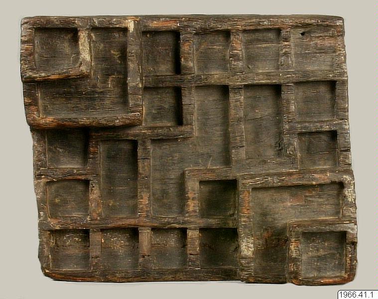 > ena sidan av brädet förmultnat och delvis saknas. Indelningen av brädet i olika rum är sålunda rent symmetrisk, och det vinkelböjda rummet i mitten kan ha varit gemensamt för båda sidorna vid spel. - Detta bräde utbjöds till salu av André emmerich, Inc. i New York i september 1966 och observerades där av H. Wassén. Brädet kunde senare förvärvas till museet för inräknat frakt, $202.20=kr. 1046.89, vilken summa erlades ur Hiding Svahns donationsmedel.