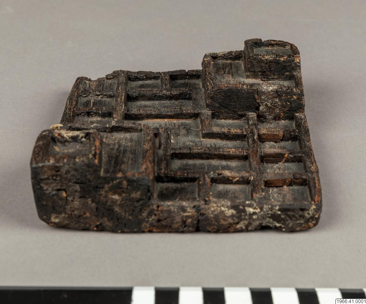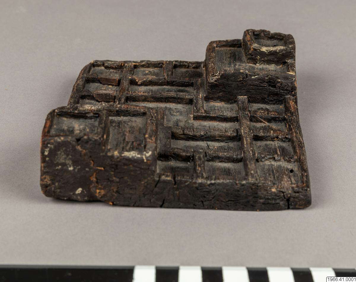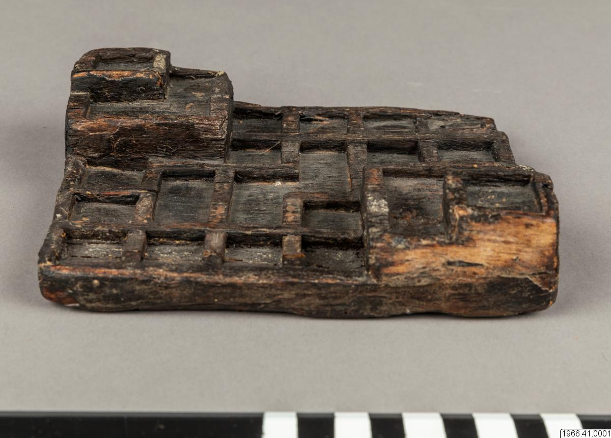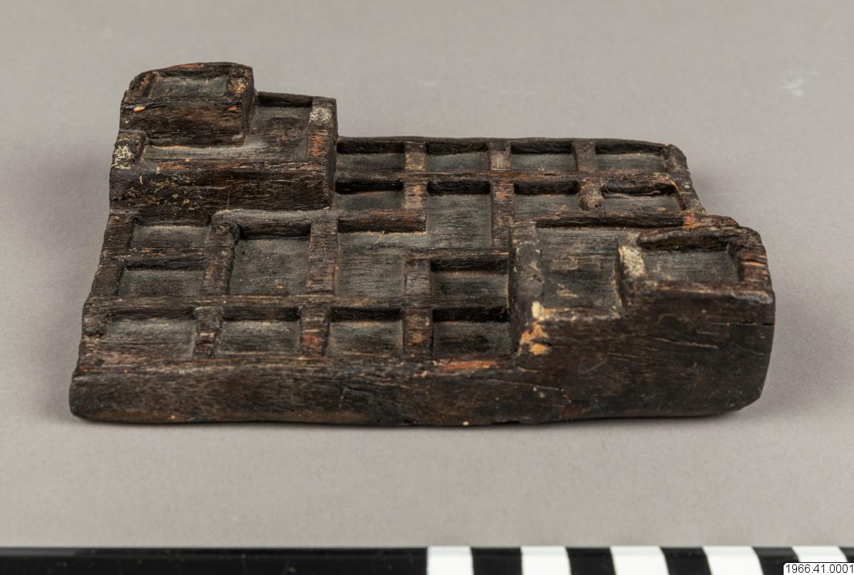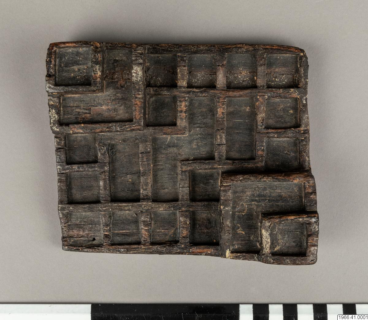 Troligen spelbräde av trä 13,5x 16,5 cm med två diametralt motsatta över resten ac spelbrädet upphöjda kvadratiska "tvårums"-"hus" möjligen à la fästningar eller temple. Resten av brädet är indelat i 17 rum, varav 13 med intakta väggar, medan tvärväggarna i fyra rum vid >