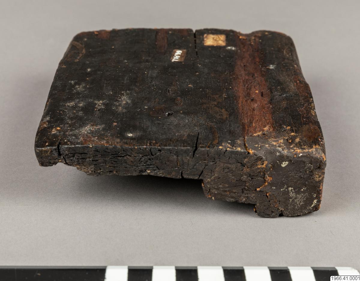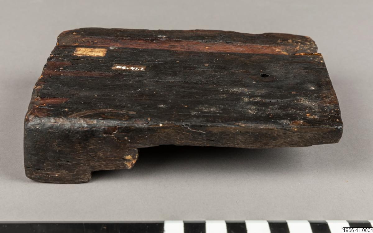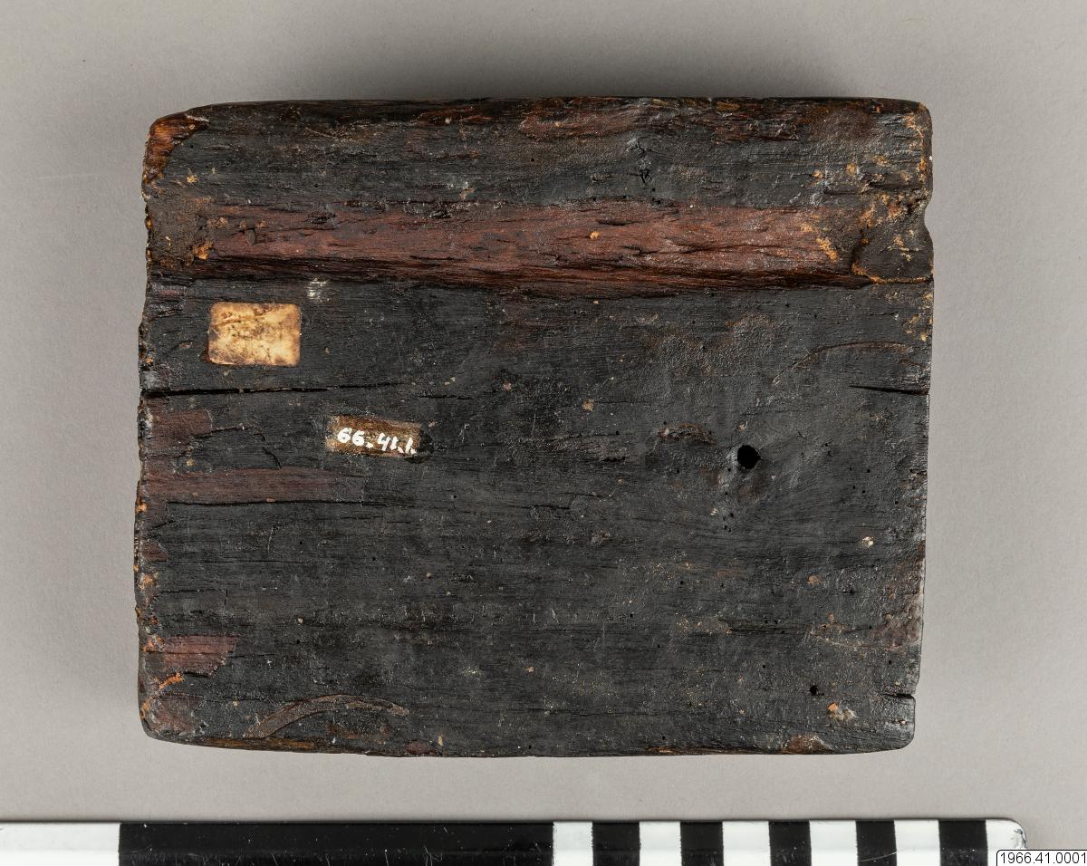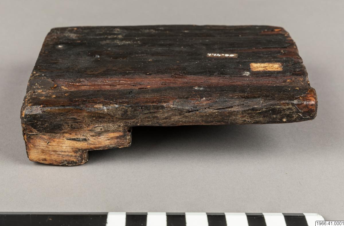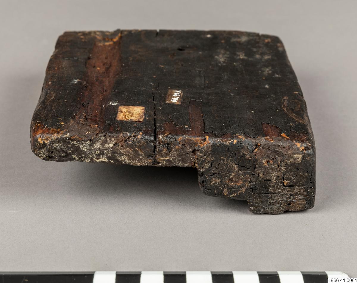 Troligen spelbräde av trä 13,5x 16,5 cm med två diametralt motsatta över resten ac spelbrädet upphöjda kvadratiska "tvårums"-"hus" möjligen à la fästningar eller temple. Resten av brädet är indelat i 17 rum, varav 13 med intakta väggar, medan tvärväggarna i fyra rum vid >