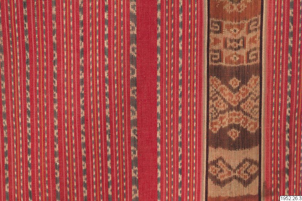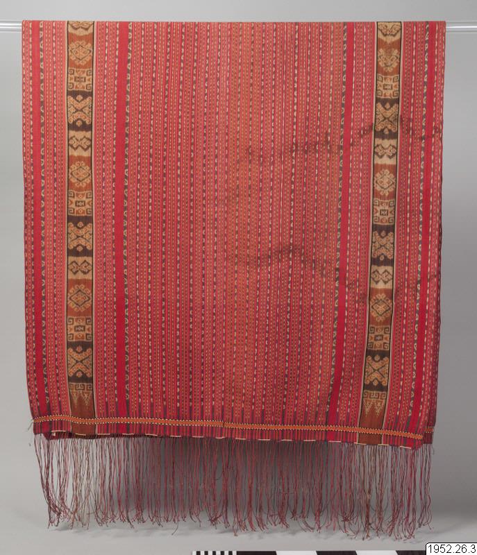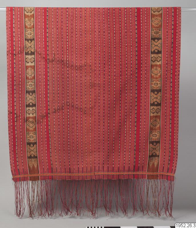 - Axelkläde (slimut). Mönstringen gjord med varpikat. Mönstret geometriskt. Storlek: 220 cm x 105 cm. Material: bomull.