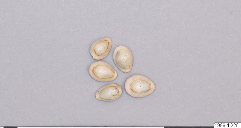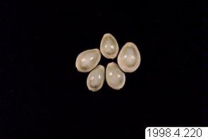 - Fem stycken snäckskal, används i samband med den religiösa offerriten puja och placeras på fat av mässing, pushpa patra (1998.04.0087) tillsammans med andra föremål (1998.04.0080-1998.04.0085 och 1998.04.0212-1998.04.0221) samt tillsammans med hel gurkmeja, ris, olika nötter, och så många frösorter som möjligt.