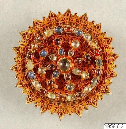 Örontrissa av guld. På ena sidan innefattningar med stenar: rubiner, safirer och zirkoner. Filigransarbeten på båda sidor. Höjd: 5,7 cm. Atjehs namn på örontrissor är subang.