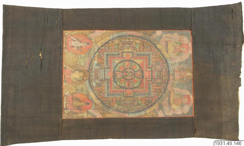 Tibetansk målning, s. k. Thangka-målning.Tibetanska thangka-målningar användes ursprungligen som hjälpmedel vid buddhistiska rituella meditationer men de kan också bäras i religiösa processioner eller hänga i tempel och enskilda bönerum. De skapas i enlighet med av traditionen fastställda regler och uppvisar en stor symbolisk och ikonografisk rikedom. Som underlag används i regel bomullsväv, i äldre tider också siden, lin och skinn. Detta bottenmaterial bestryks med gelatinlim och sedan med en massa bestående av limvatten och krita eller vit lera. Torkad grund poleras med glatta stenar. Själva målningen utförs i tempera med lim, oftast gelatin, som bindemedel. Guldpulver rivs med linolja. Som färgstoff används mineralpigment och metallpulver. Målningen utförs i flera skikt med täckande eller transparenta färger. En färdig målning monteras på ett tygunderlag och inramas med en brokadbård. Vatten, rök och omild behandling ligger bakom de oftast förekommande skador på thangka målningar. Thangka-målningar utförs ofta av lekmän men de har inget religiöst värde innan de helgats av en lama under en särskild ceremoni som gör den avbildade gestalten närvarande i målningen.