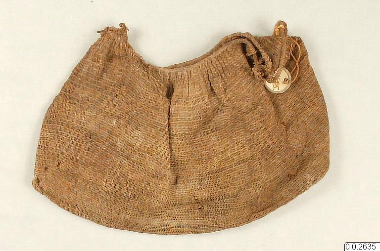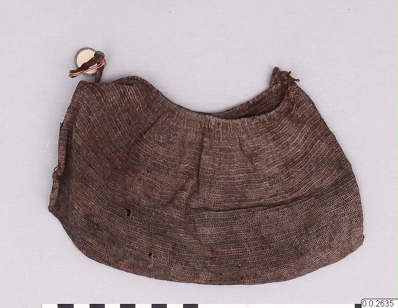 - Virkad pung, inneh. snäckpengar. Snäckpengarna uppträdda på en vidja som brutits sönder i två delar. (katalogkort/originalbeskrivning)