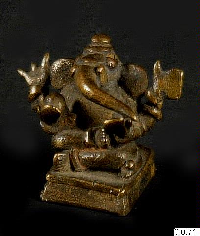 Liten statyett föreställande en fyrhänt, sittande Ganesha. Guden är känd som Vighneshvara ("hindrens gud") eller Vighnavinashana ("undanröjare av problem"). I sin övre högra hand håller han en trishula (treudd) och i den övre vänstra en parashu (yxa). I sin lägre högra hand håller han en sötsak och i den vänstra vilar gudens snabel. Ganeshas två öron står rakt ut.