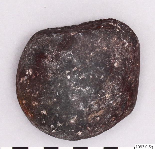 6,5 x 7,5 cm stor sten något urgröpt på en sida, i övrigt rundade former. Möjligen enkelt verktyg.