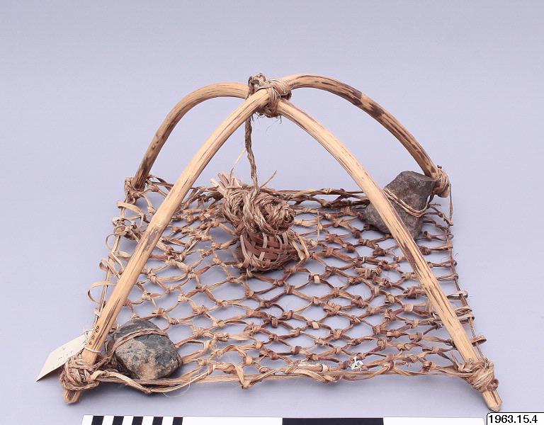 Krabbhåv. Botten i nätmönster. Av växtmaterial. Två krysslagda, böjda käppar håller upp denna botten. Lina fastsatt där käpparna möts. Sidan i botten: 56 cm. Två stenar tjänstgör som sänke. I håven också ett knyte. Agnet sitter här, och till detta knyte leder ett växtrör som