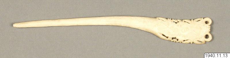 - 28 cm lång pryl hårnål av ben, ena sidan försedd med ristad ornamentik (Orig.nr. 488) (katalogkort/originalbeskrivning)