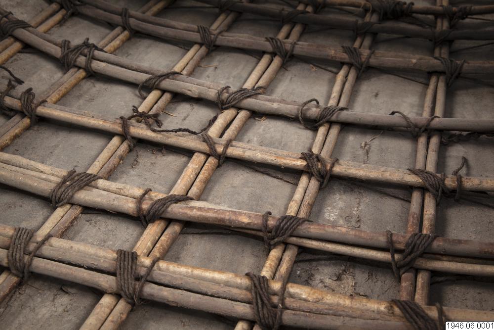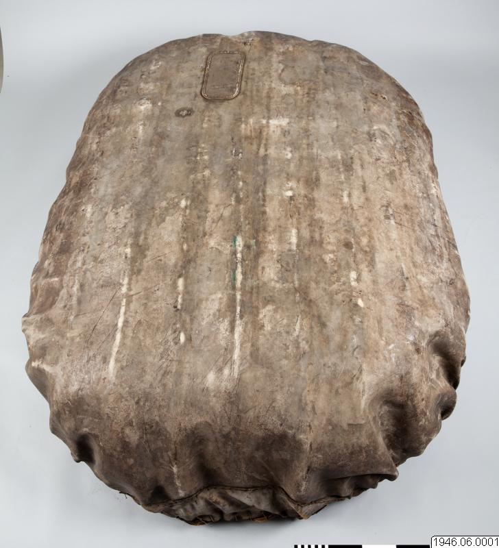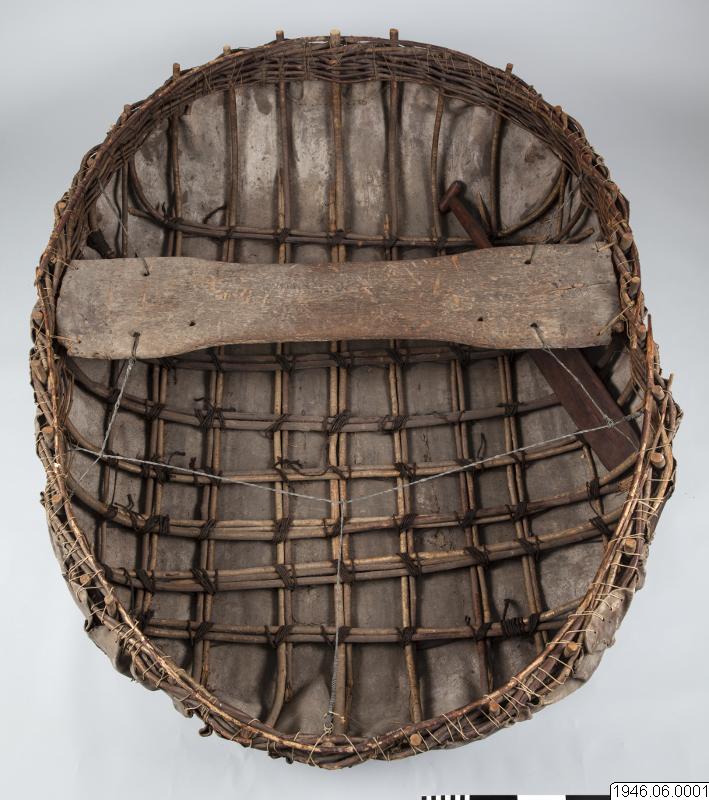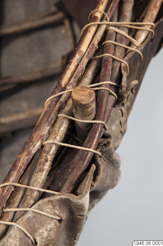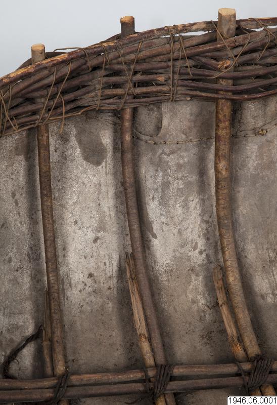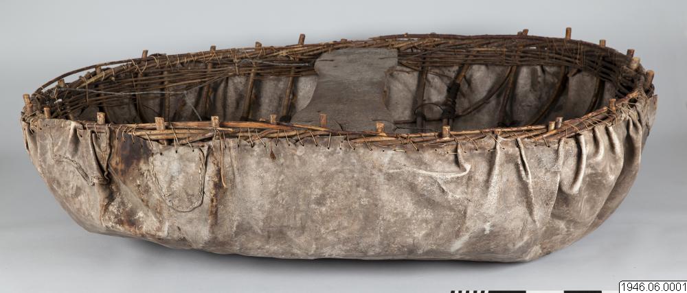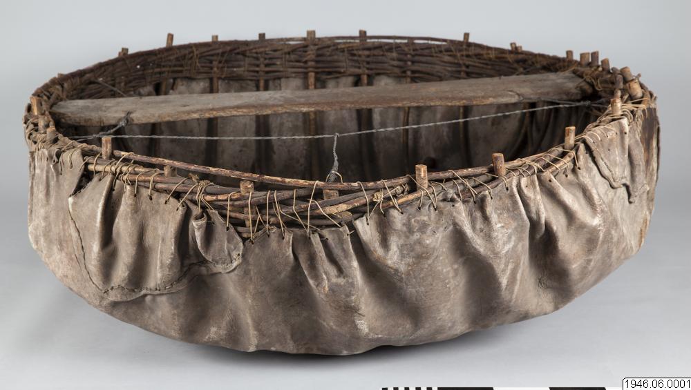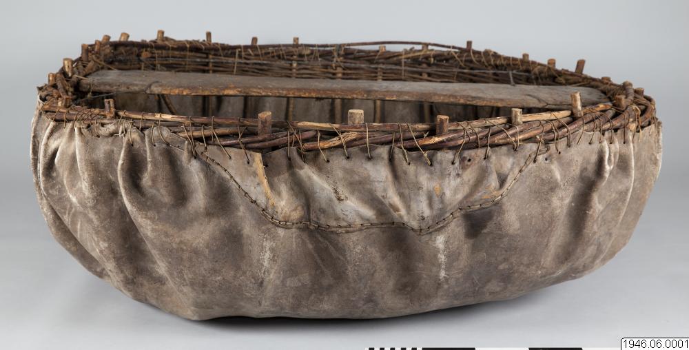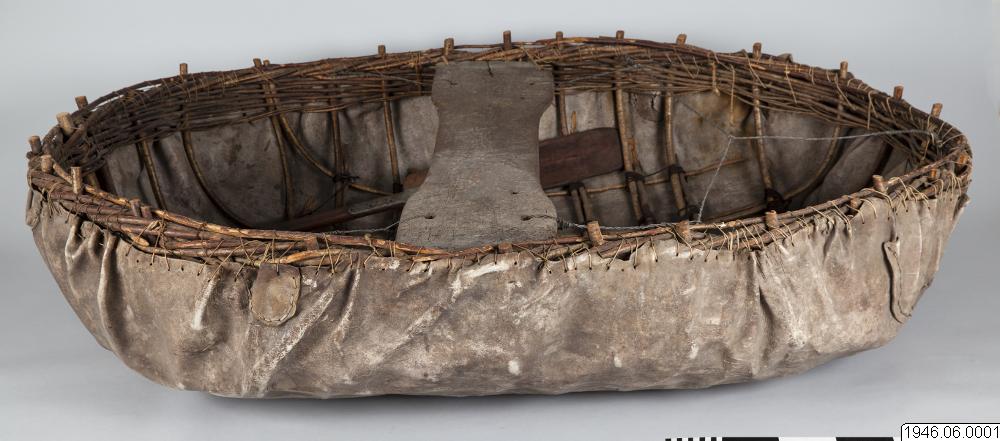 "Coracle" rundbåt, gjord av kohud och hasselvidjor, från Oldbridge nära Drogheda vid floden Boyne, Irland. Tillverkad av en gammal rundbåtbyggare, Joseph Tierman, nu ende kvarlevande båtbyggare som varit lärling hos O'Brien i Slaien vid Boyne. Båten är tillverkarens näst sista arbete. Köpt i juli 1946 för £10 av tillverkaren genom docent Nils Holmer. Litt. Hornell and Callander: British coracles and Irish curraghs, London 1938. Jmfr. även bilder i fotoarkivet på Etnografiska Avdelningen, Göteborgs Museum.