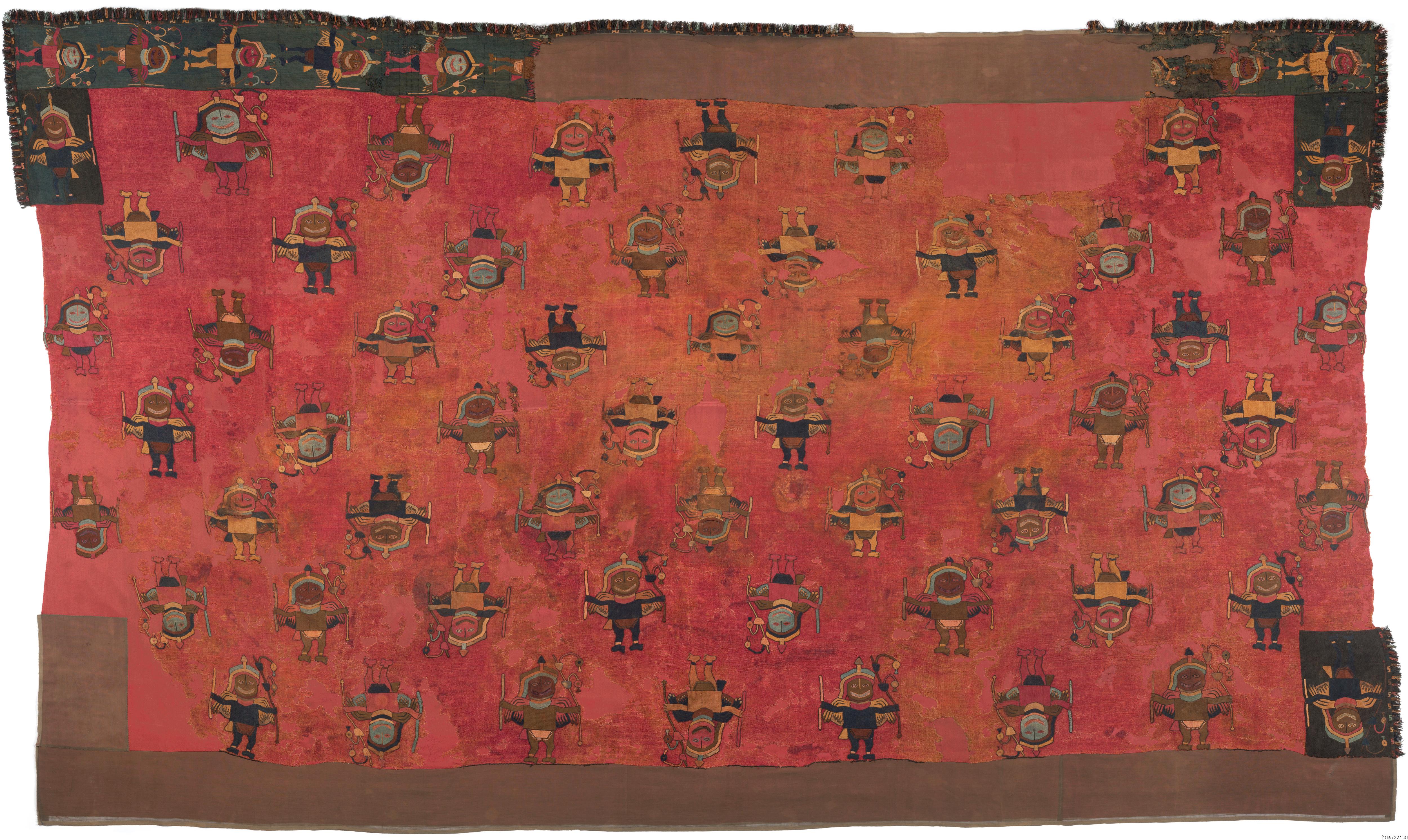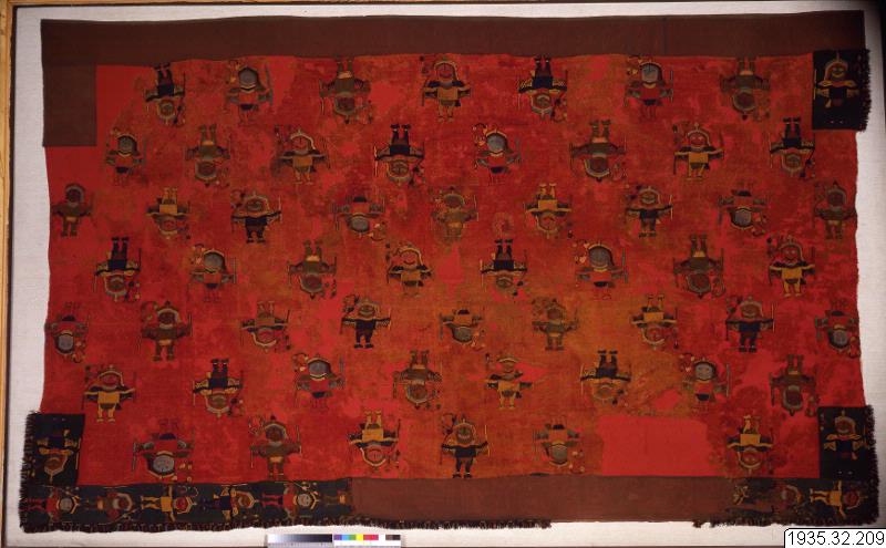 The border and middle part of this mantle are woven with different thread counts, but the embroidered stitches cover equal numbers of threads in the fabric, with the result that the border and middle part have differently sized embroidered figures.