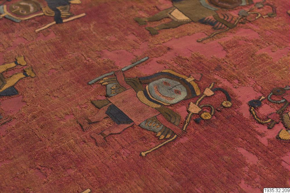 Människoliknande figur som ser ut att ha på sig tunika, ländkläde och turban. Ur turbanen sticker något som kan vara en kniv ut. Vingar sticker ut bakom ryggen, det kan vara en cape gjord av fjädrar. Figuren har band runt vristerna. I ena handen håller figuren en rak stav. I andra handen finns en stav med vass spets och två hängande föremål. Dessa föremål skulle kunna vara klockor eller bjällror som är avbildade samtidigt från sidan och underifrån. Figur nummer 7 i textil 1935.32.0179 (monter 4) bär på liknande föremål.