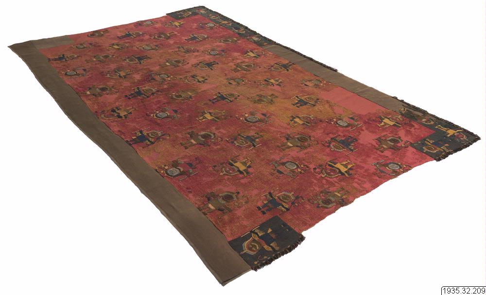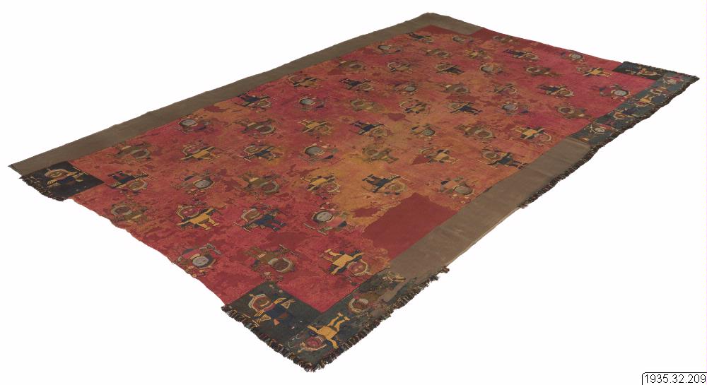 figurer i olikfärgat ullgarn. Broderierna i stjälkstygnsteknik. Längst långsidorna rester av en 12 cm bred bård av bomullsväv i tuskaftsteknik, helt täckt av broderier i ullgarn (samma motiv som på den röda manteln, på mörkblåbotten) Längst bården och c:a 27 cm. runt hörneen finns rester av en 2 cm bred frans i olikfärgade ullgarner utanför 6 rader "kedjestygn" av mörkblått ullgarn med S-formade figurer i olika färger. I tre av hörnen på den röda vävnaden finns broderade mörkblå fyrkanter, 21x15,5 cm. med samma motiv som på manteln. Garn s-z ullgarn, 2-blå, 3 röda, 2 bruna, 2 gula nyanser och mörkblått.