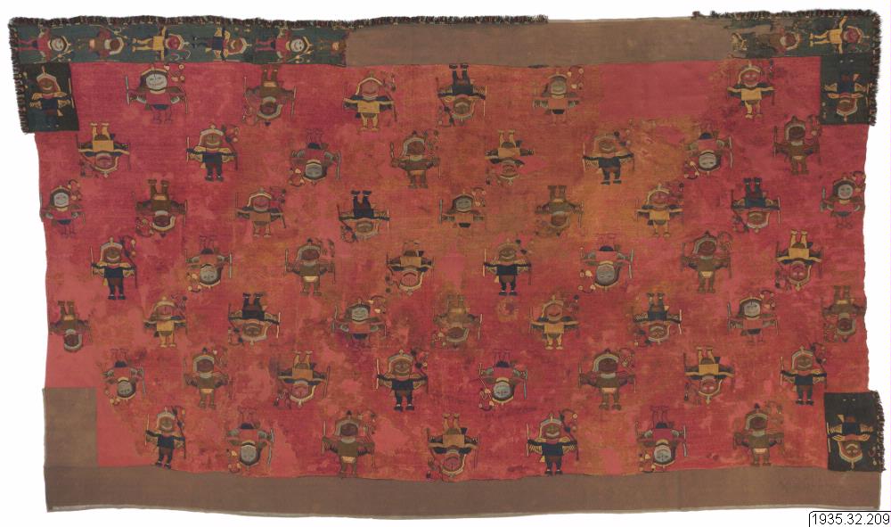 figurer i olikfärgat ullgarn. Broderierna i stjälkstygnsteknik. Längst långsidorna rester av en 12 cm bred bård av bomullsväv i tuskaftsteknik, helt täckt av broderier i ullgarn (samma motiv som på den röda manteln, på mörkblåbotten) Längst bården och c:a 27 cm. runt hörneen finns rester av en 2 cm bred frans i olikfärgade ullgarner utanför 6 rader "kedjestygn" av mörkblått ullgarn med S-formade figurer i olika färger. I tre av hörnen på den röda vävnaden finns broderade mörkblå fyrkanter, 21x15,5 cm. med samma motiv som på manteln. Garn s-z ullgarn, 2-blå, 3 röda, 2 bruna, 2 gula nyanser och mörkblått.