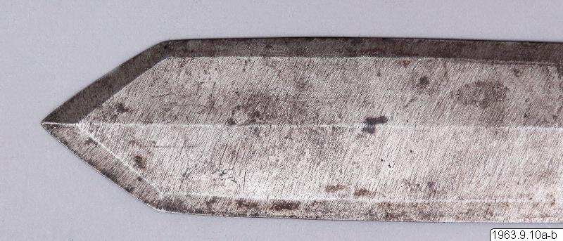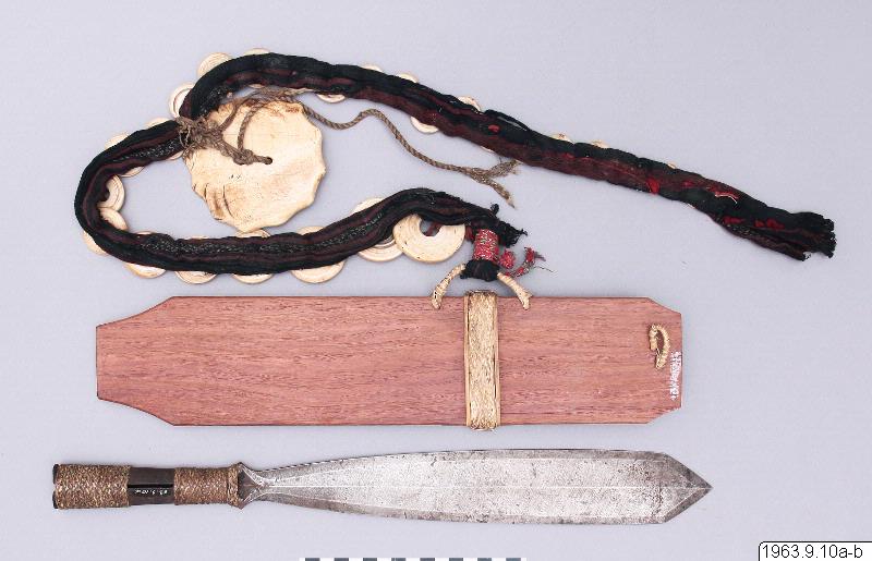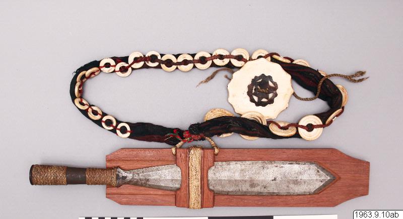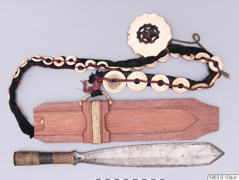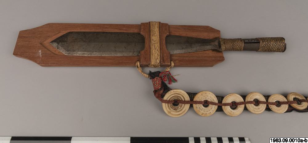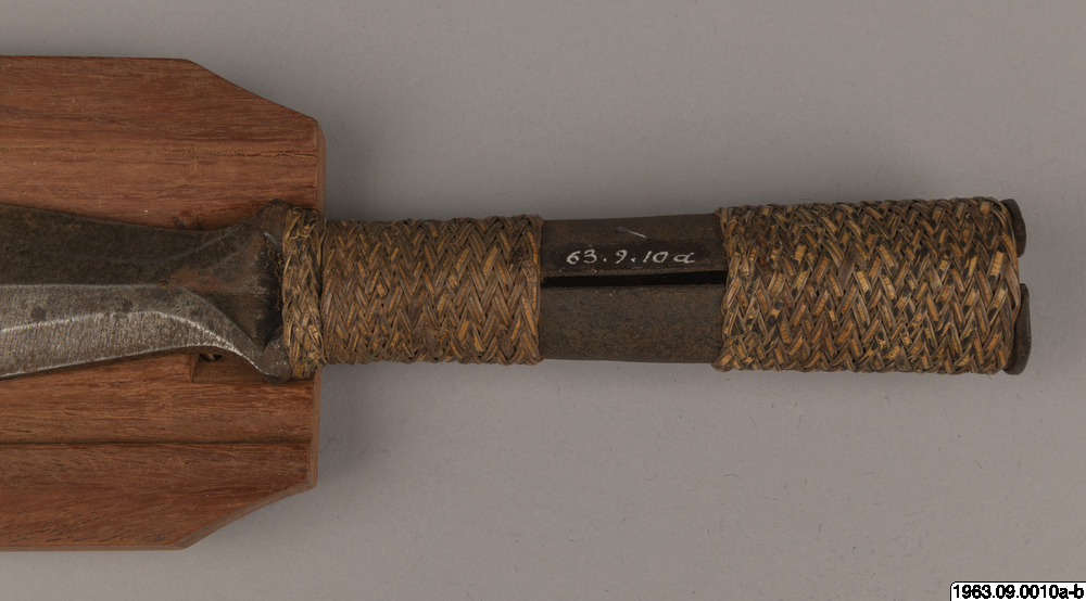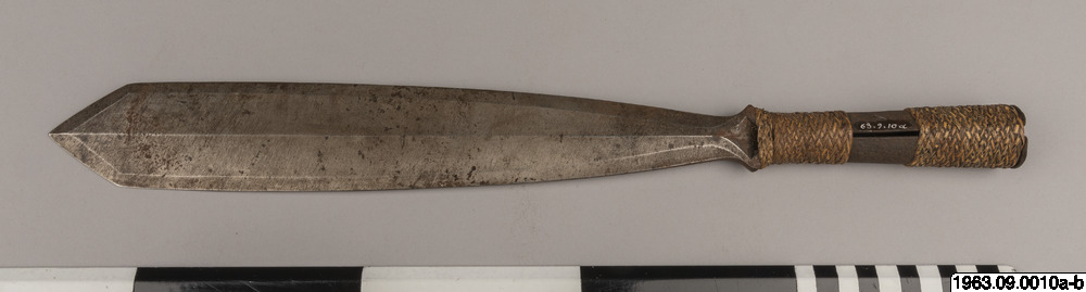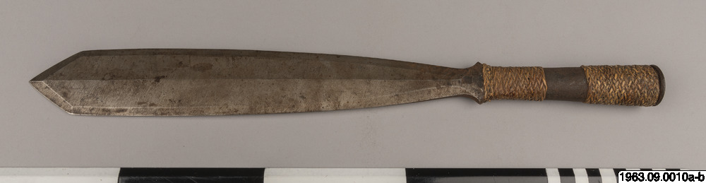 Kort dolkliknande svärd av stål. S.k. bolo. Har ett spjutliknande utseende, fästet har formen av en holk. Denna är prydd med flätningar.