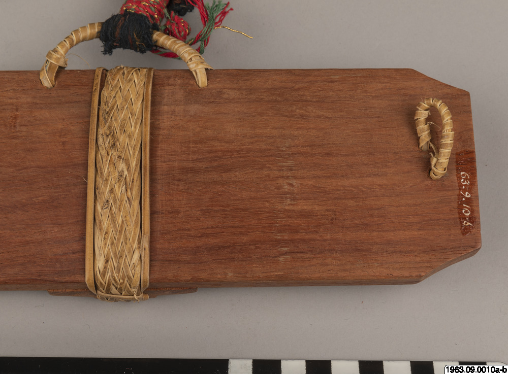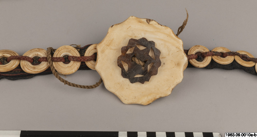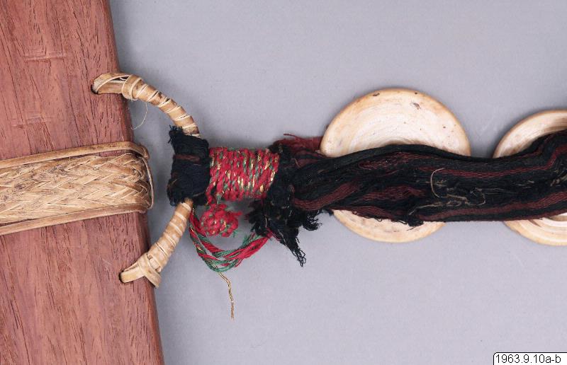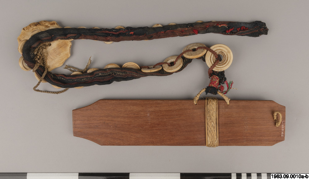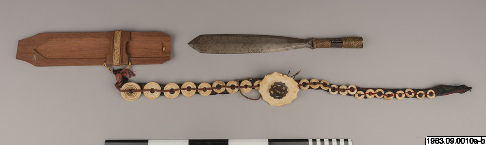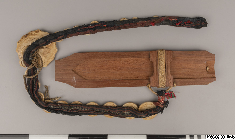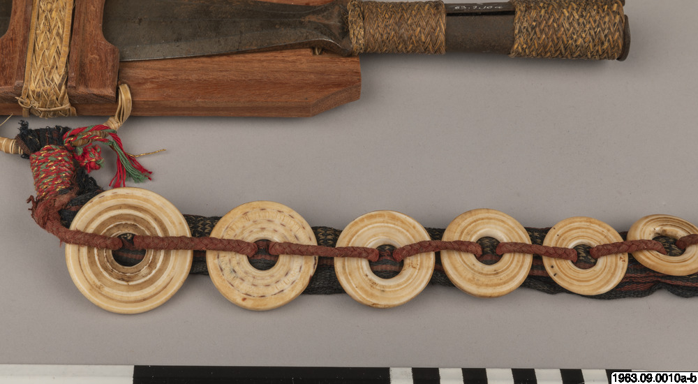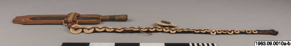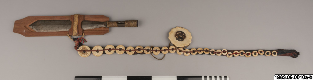 Klingans ena sida ligger bar. Baljans längd: 40 cm, Gehäng prytt med snäckskalsringar och en stor snäckskalsskiva. Denna i sin tur prydd med en genomskuren sköldpaddasskiva i kapkapteknik. Denna med balja och gehäng, kallas ginuttu. Bolo.